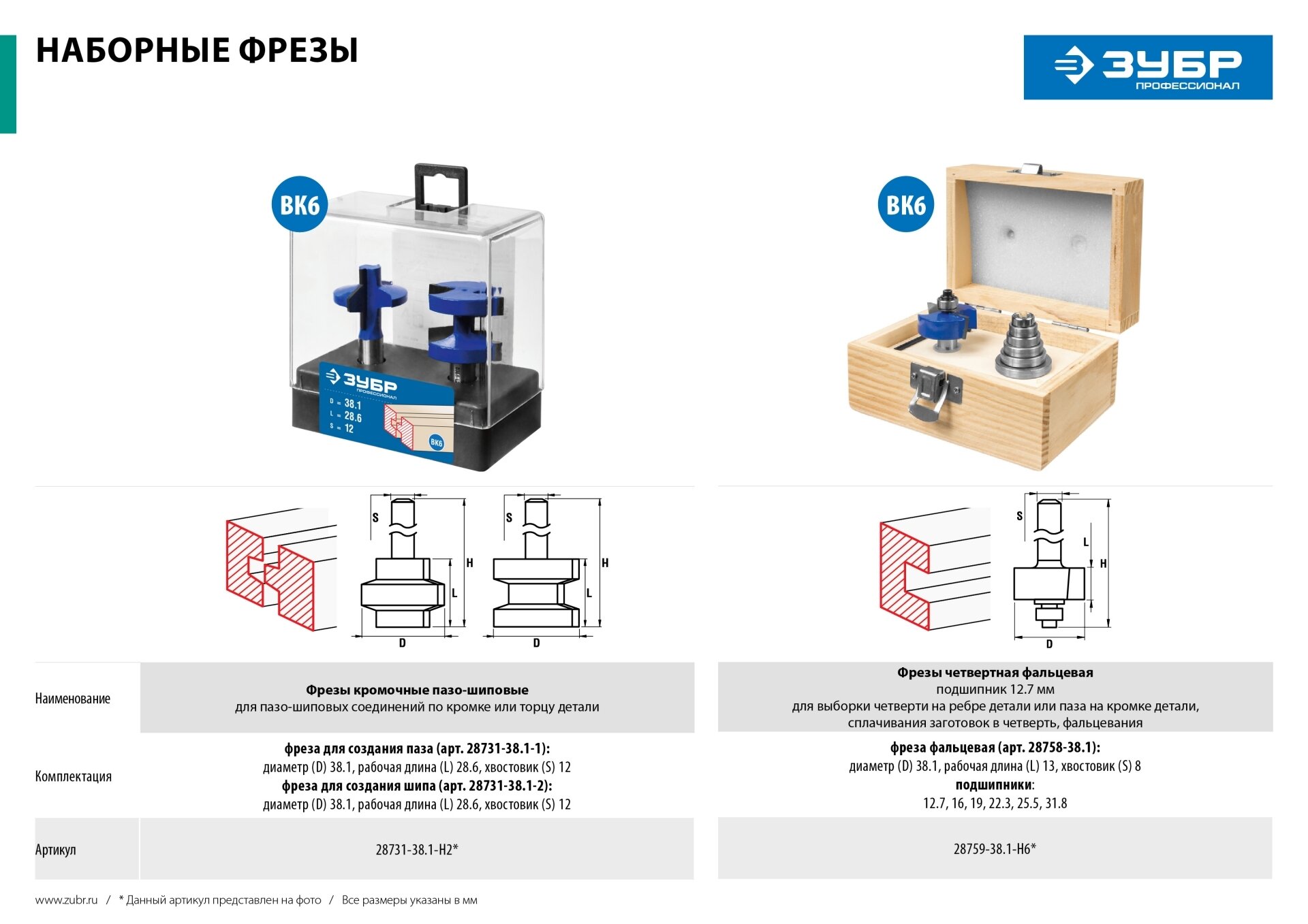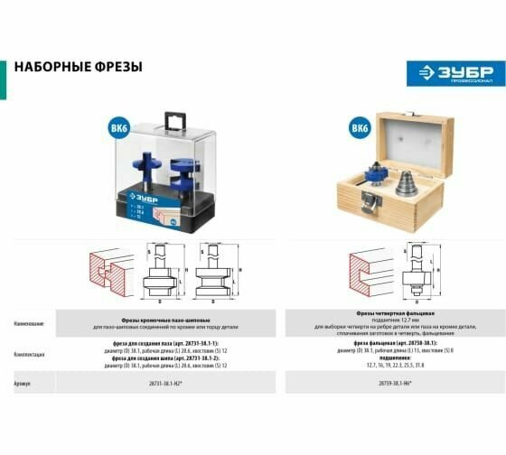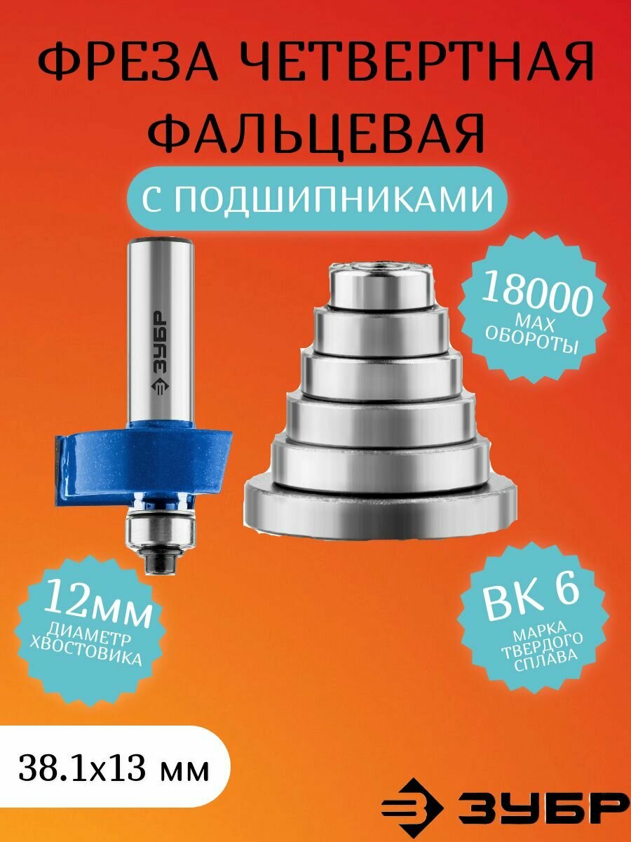 Фреза четвертная фальцевая в наборе с подшипниками, D= 38,1мм, хв.-12 мм, ЗУБР Профессионал