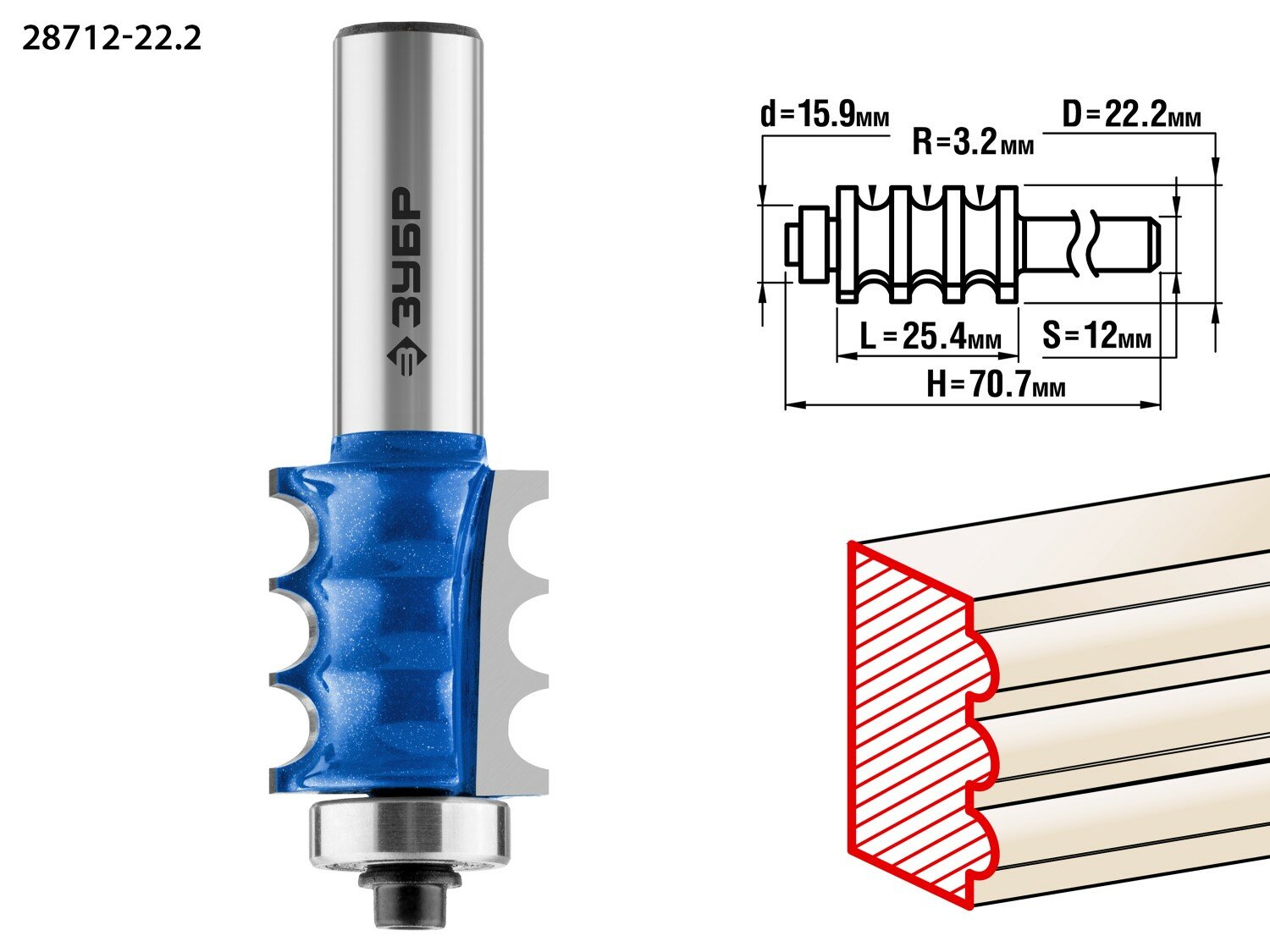 Фреза кромочная фигурная №1, D= 22,2мм, рабочая длина-25,4мм, хв.-12мм, d-15,9мм, ЗУБР Профессионал