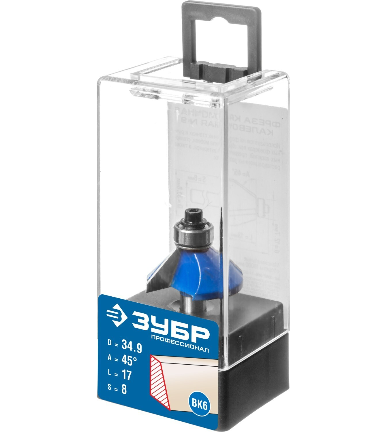 Фреза кромочная калевочная(фасочная) №9, D= 34,9мм, рабочая длина-17мм, угол наклона-45 градусов, хв.-8мм, d-12,7мм, ЗУБР Профессионал