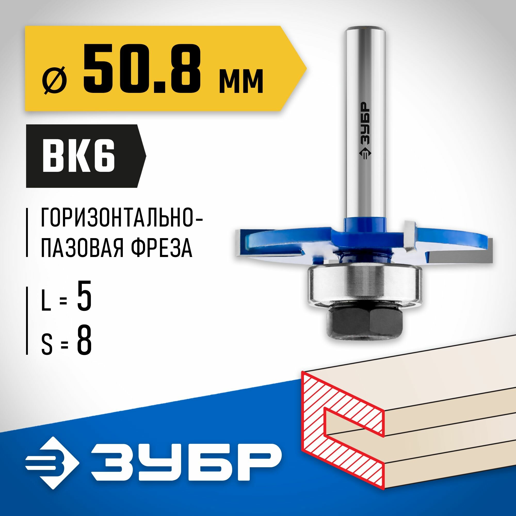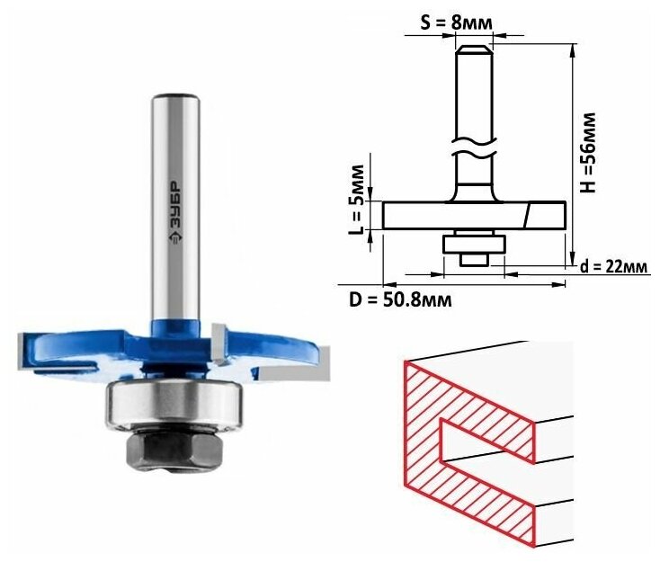 Фреза горизонтально-пазовая, D= 50,8мм, высота-5мм, хв.-8мм, d-22мм, ЗУБР Профессионал