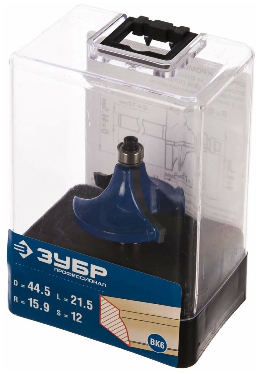 Фреза кромочная калевочная №1, D= 44,5мм, рабочая длина-21,5мм, радиус-15,9мм, хв.-12мм, d-9,5мм, ЗУБР Профессионал