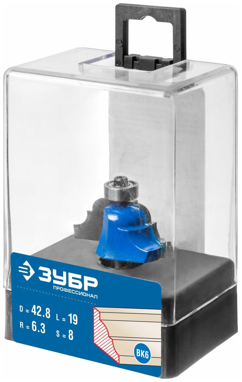 Фреза кромочная калевочная №4, D= 42,8мм, рабочая длина-19мм, радиус-6,3мм, хв.-8мм, d-12,7мм, ЗУБР Профессионал