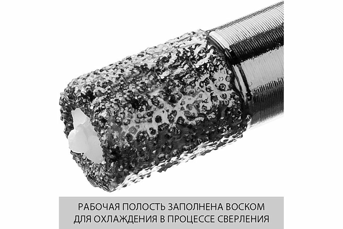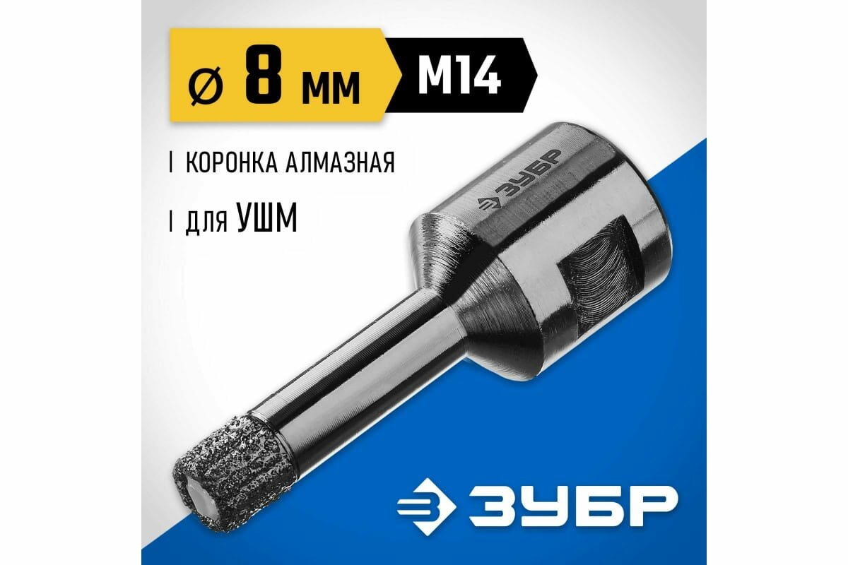 Высокоскоростная алмазная коронка по керамограниту и железобетону ЗУБР Профессионал М14, вакуумное спекание, 8 мм, для УШМ 29865-08-M14 для сверления отверстий в керамограните, камне, керамике, бетоне, кирпиче, ограниченно в листовом металле, дереве и комбинаций всех этих материалов. Сверление в режиме безударного сверления. Технология Высокотемпературного Вакуумного Спекания алмазов позволяет работать алмазным инструментом без применения водяного охлаждения и сверлить самые твердые материалы. Высота алмазного слоя 15 мм. Глубина сверления — 35 мм. Высокая плотность и равномерное расположение алмазов на рабочей кромке гарантируют эффективную работу и продолжительный срок службы оснастки. Рабочая полость заполнена воском для охлаждения в процессе сверления.Преимущества Сверление керамогранита высшего класса твердости Высокая скорость сверления Возможность работы без обязательного охлаждения благодаря вакуумной спайке алмазов Увеличенный в несколько раз ресурс по сравнению с обычными гальваническими коронками Рабочая длина 35 мм для плитки любой толщины Универсальность применения: керамогранит, камень, керамика, бетон, кирпич, ограниченно листовой металл, дерево и комбинации всех этих материалов