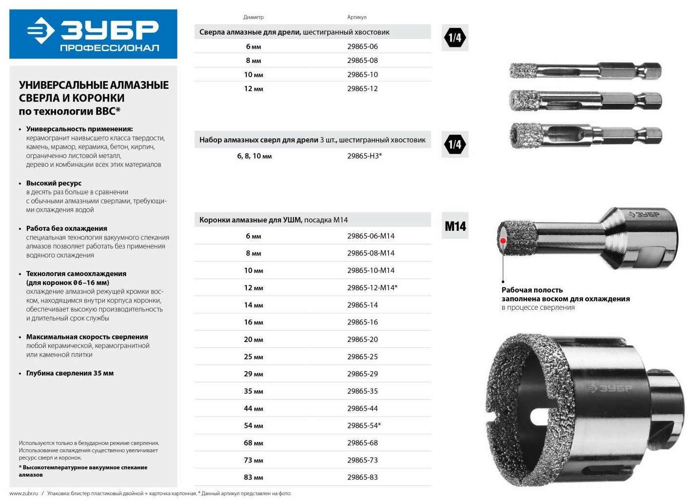 | Доп. наименование Водопад | Коронка алмазная по керамограниту Зубр 29865-16 вакуумное спекание алмазов, d=16 мм, HSS-R, быстрорежущая сталь М2(S6-5-2) Р6М5, класс А посадка М14 |