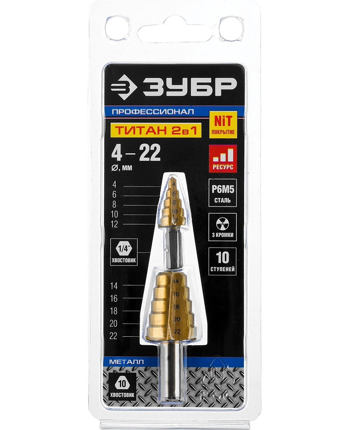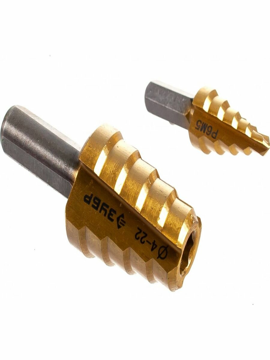 Сверло ступенчатое 2-х модульное по сталям и цвет. мет., ст. Р6М5 с покрытием TiN, 4-22(4-12, 14-22), 10 ступ., трехгран. хв., ЗУБР "ПРОФЕССИОНАЛ"