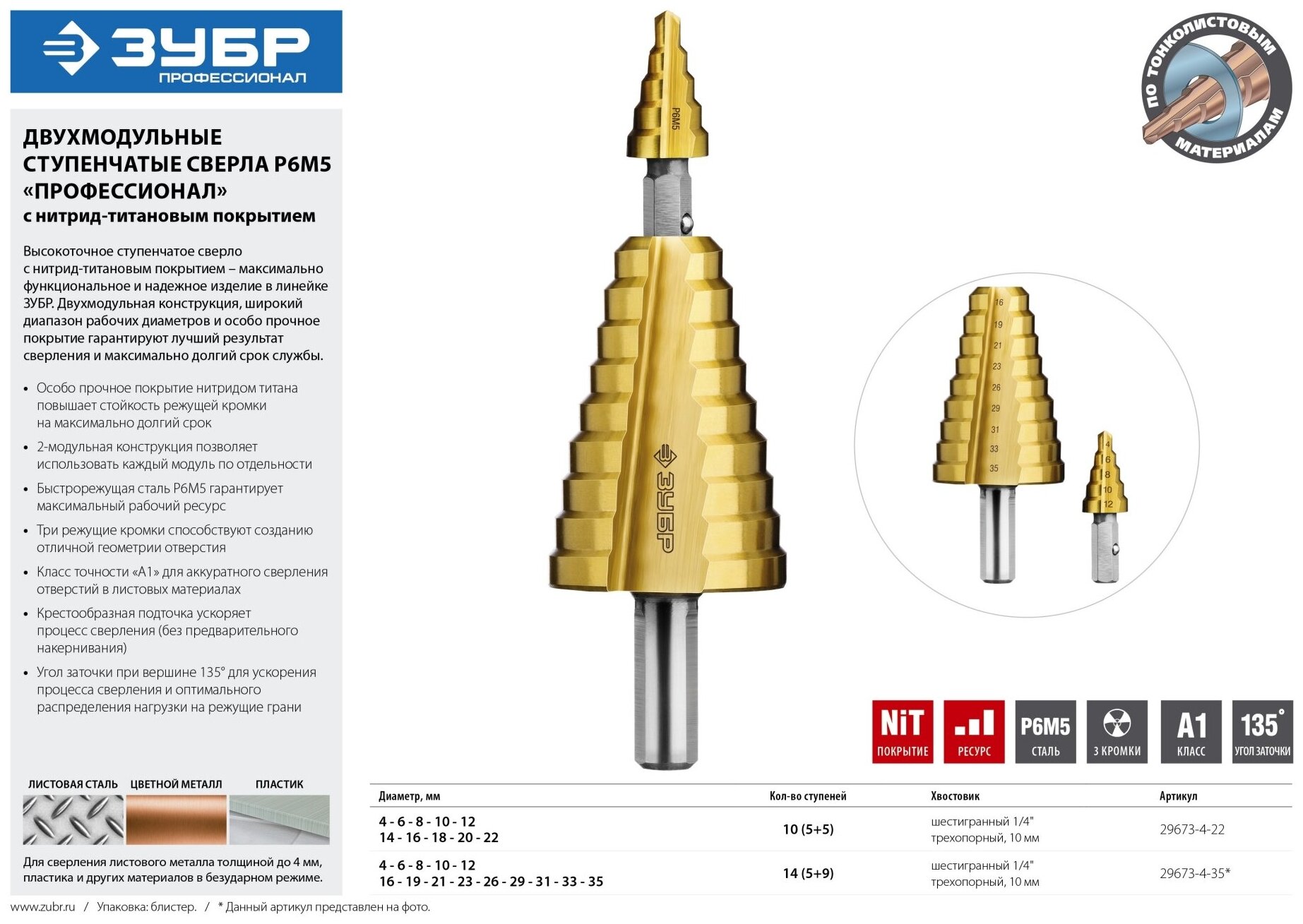| Доп. наименование Водопад | Сверло ступенчатое Зубр 29673-4-22 4-22мм, HSS-R, быстрорежущая сталь М2(S6-5-2) Р6М5, класс А 11 ступеней, кобальтовое покрытие |