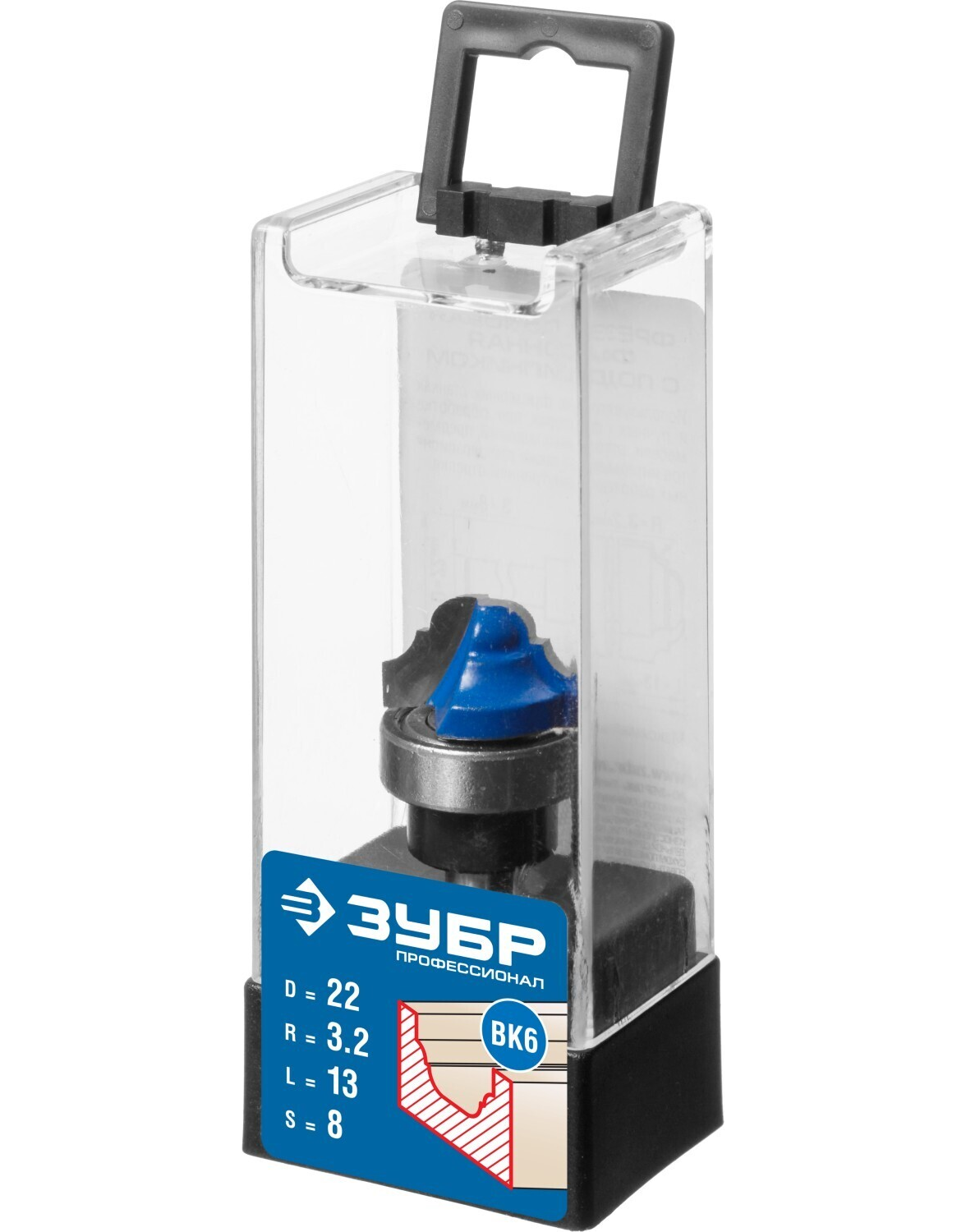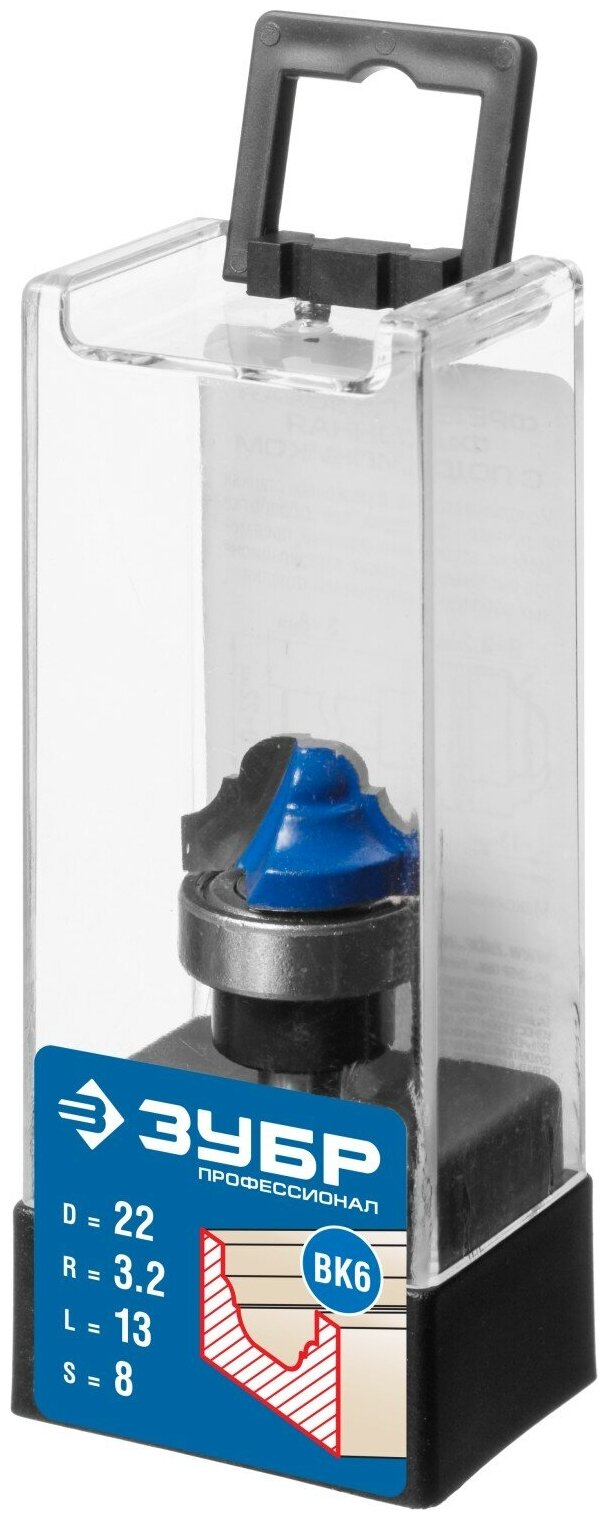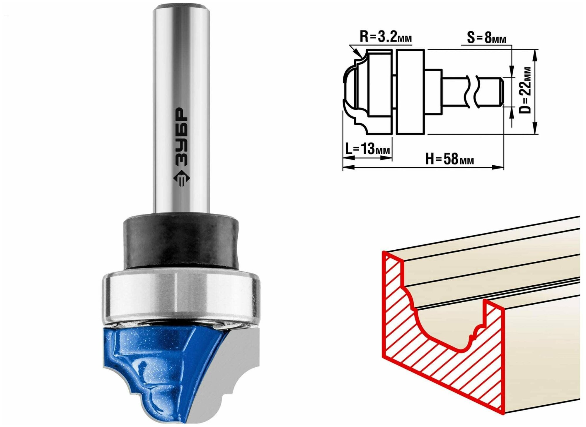 Фреза пазовая фасонная с верхним подшипником, D= 22мм, рабочая длина-13мм, радиус-3,2мм, хв.-8мм, d-22мм, ЗУБР Профессионал