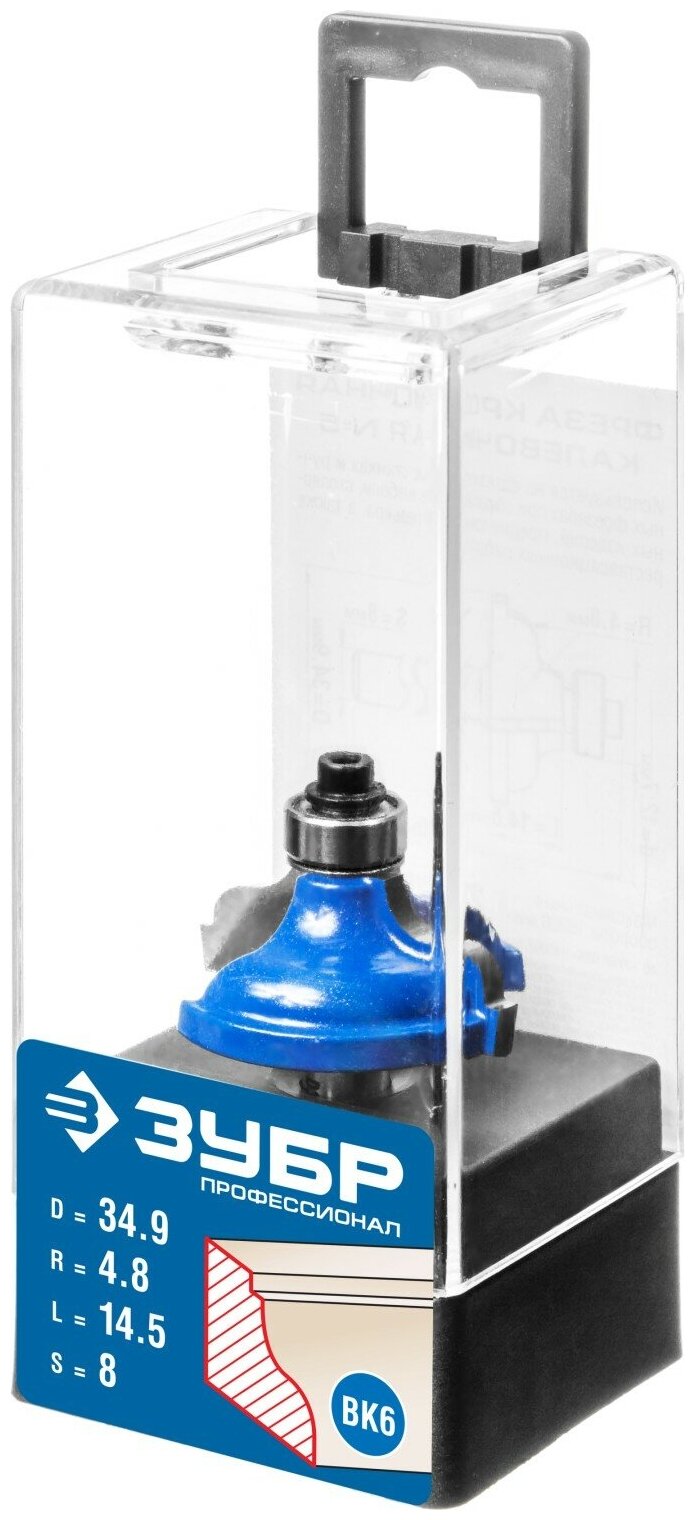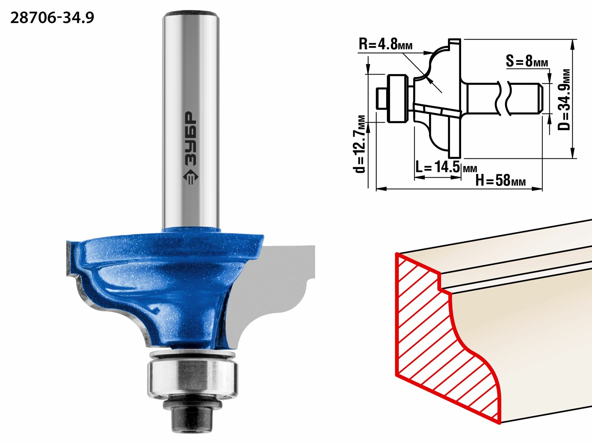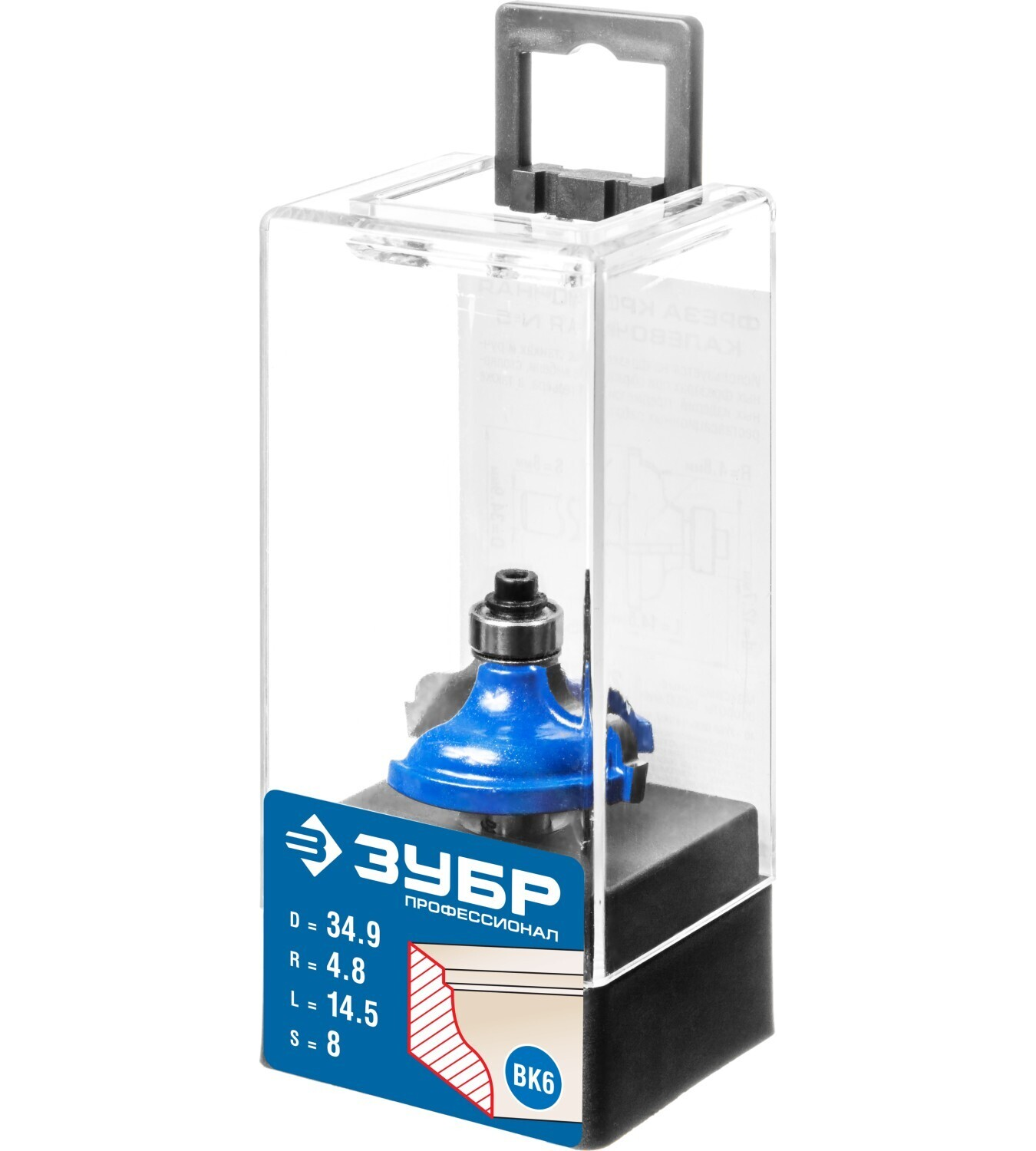 Фреза кромочная калевочная №5, D= 34,9мм, рабочая длина-14,5мм, радиус-4,8мм, хв.-8мм, d-12,7мм, ЗУБР Профессионал