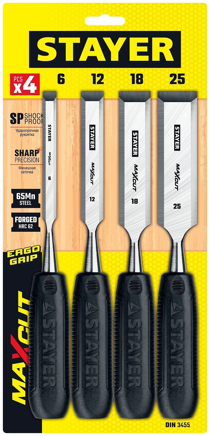 Набор STAYER Стамески "MASTER" плоские с пластмассовой ручкой, 6/12/18/25, 4 шт это 4 стамески, которые используются для строгания, выборки отверстий и углублений в древесине мягких или твердых пород дерева. Размер стамесок 6 мм, 12 мм, 18 мм, 25 мм.