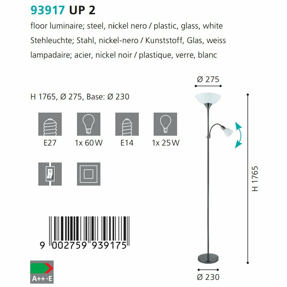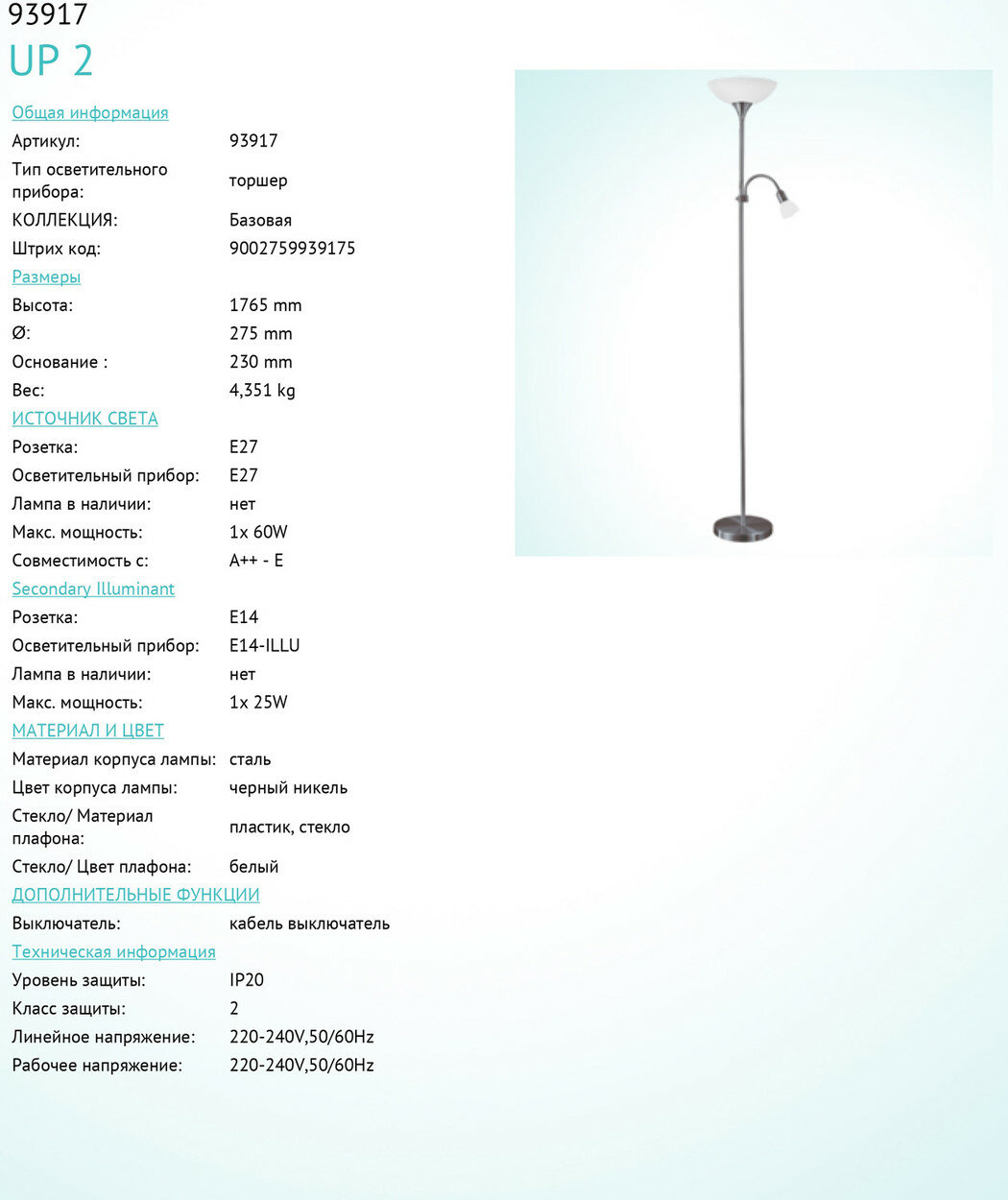 Данный торшер — качественный продукт светотехники, который будет служить в течении длительного срока. Данная модель в стиле «Современный» от Австрийской компании «Eglo» принадлежит серии «Up 2». Гарантия производителя: 12 мес.