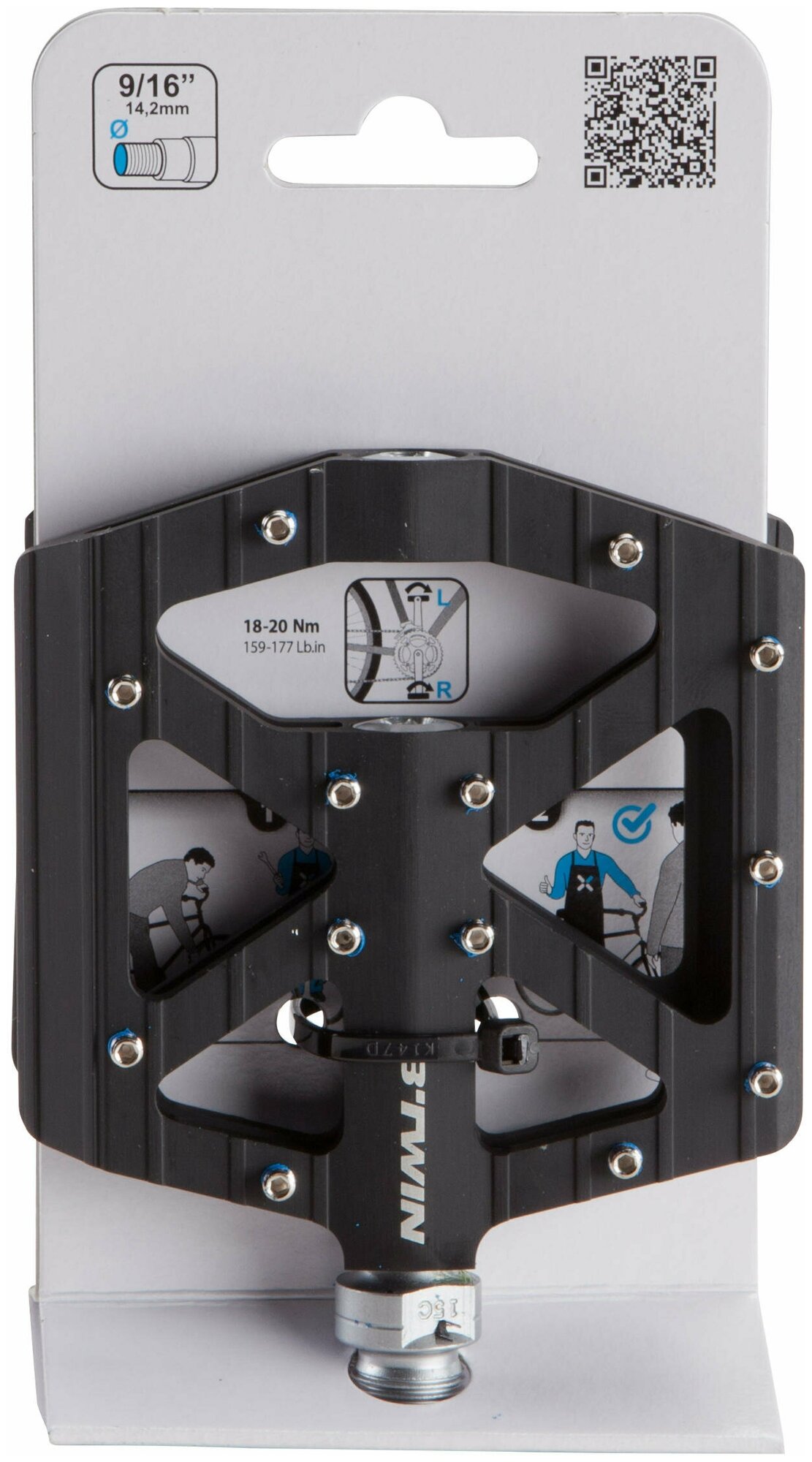 Наши плоские педали 900 спроектированы из алюминия для занятий взрослых на горных велосипедах All Mountain, Enduro или Freeride. Благодаря ширине и регулируемым штифтам наших плоских алюминиевых педалей 900 для горного велосипеда Вы получите стабильность и управляемость во время езды на долгое время! преимущества Протектор подошвы - Регулируемые металлические штифты обеспечивают очень хороший захват. Стабилизация - Большая опорная поверхность и низкая высота: устойчив. стопы и управление вел. Вес - 376 г (пара) Прочность - Ось из стали, корпус и каркас из алюминия. Техническая Информация совместимость С велосипедами Резьба педали соответствует английскому стандарту резьбы 9/16", совместима со всеми взрослыми горными велосипедами, гибридными, городскими и шоссейными велосипедами, представленными на рынке. Установка Для установки педалей Вам понадобится рожковый ключ на 15 мм или шестигранный ключ на 6 мм. Будьте внимательны, соблюдайте направление завинчивания каждой педали: по часовой стрелке с правой стороны, против часовой стрелки с левой стороны. Размеры Размеры платформенной части: Длина: 96 мм Ширина: 99 мм. Толщина (за счет установки регулируемых штифтов): 20 мм. Совет ПО использованию Следует избегать нажатия педалей на пятку или свод стопы, которые часто становятся причиной боли и усталости с течением времени. Для хорошего комфорта и эффективности педалирования ступня должна быть размещена так, чтобы небольшая подушечка под плюсневой костью находилась над осью педали. Материалы Ось: хромомолибденовая сталь. Корпус: алюминий. Каркас: алюминий. Подшипники: шариковые.