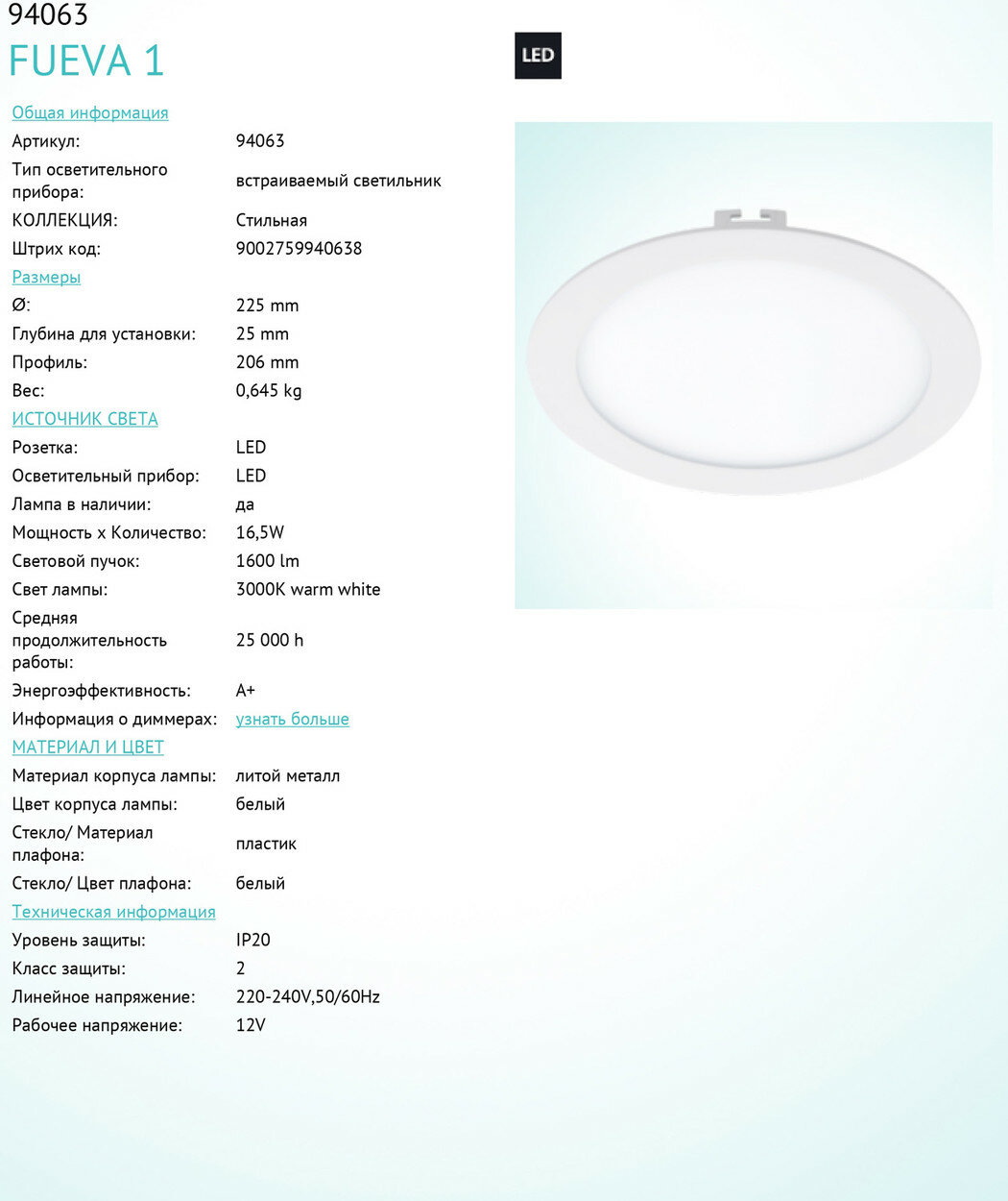 Встраиваемый светодиодный светильник - продукт известной компании Eglo (Австрия). Имеет максимальную мощность 16 Вт, освещает площадь до 3 кв. м. Отлично подойдет для таких мест, как гостиная, прихожая и коридор, спальня, кабинет, кухня. Впишется в интерьеры следующих стилей: современный.