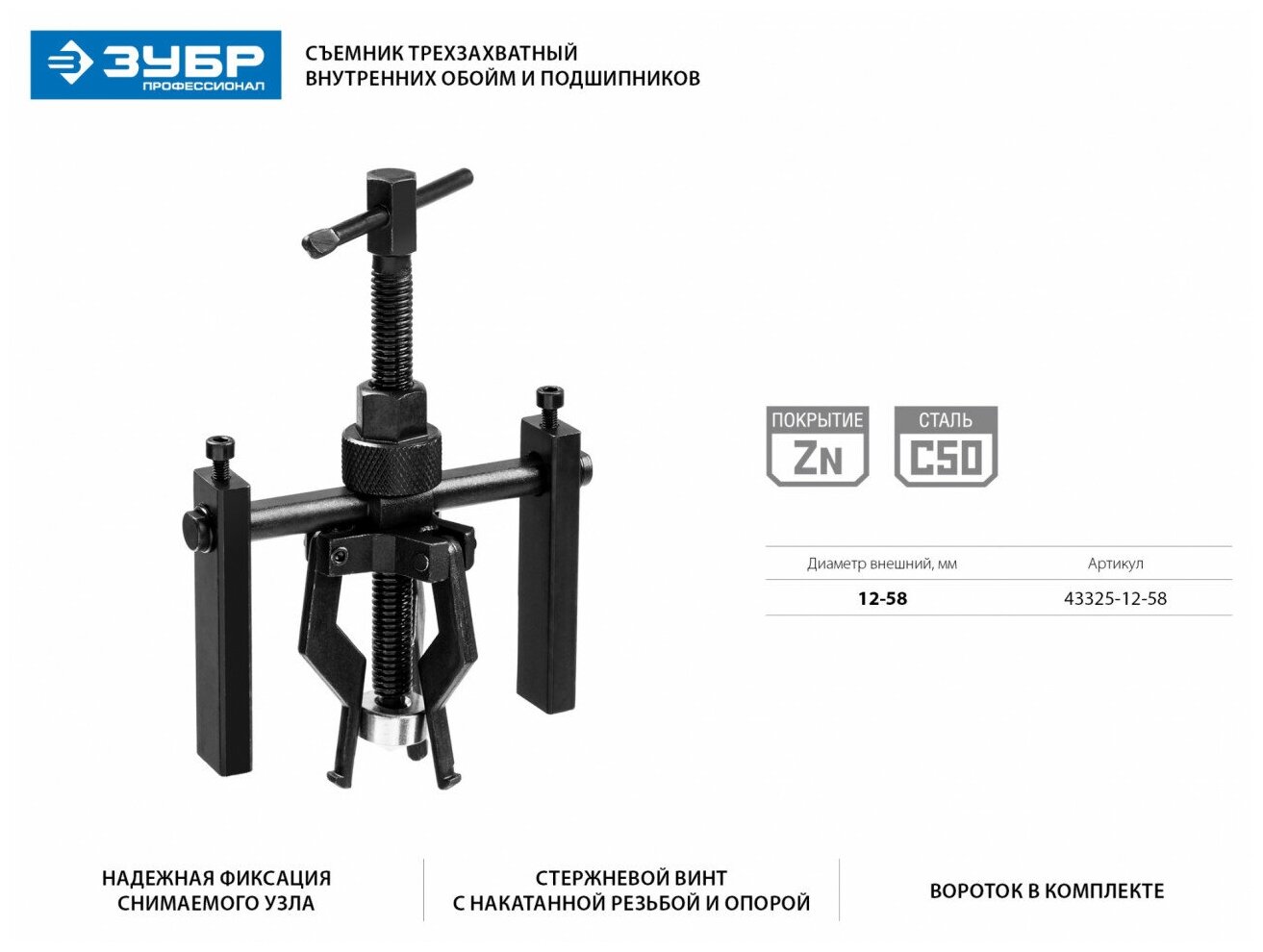 Трехзахватный съемник подшипников и внутренних обойм ЗУБР 43325-12-58