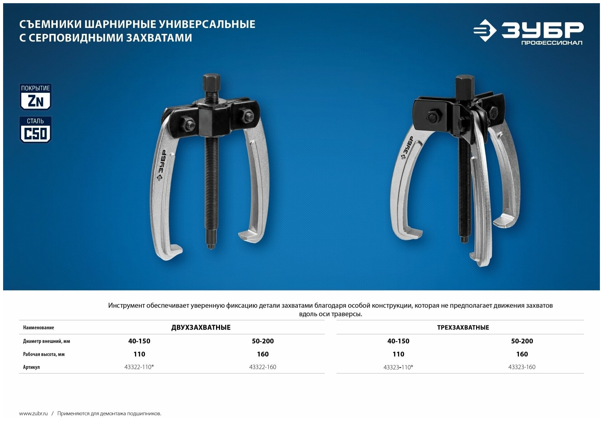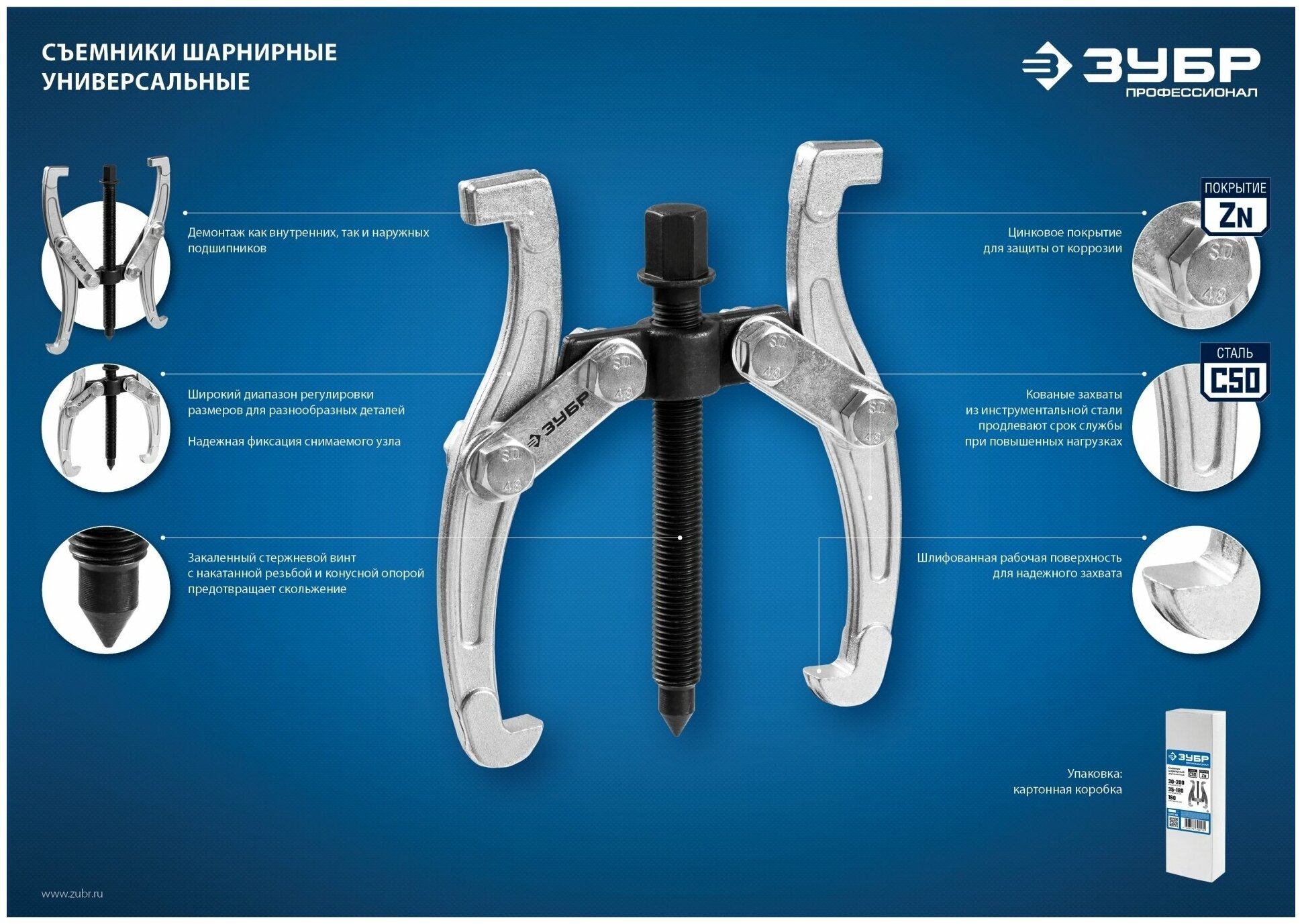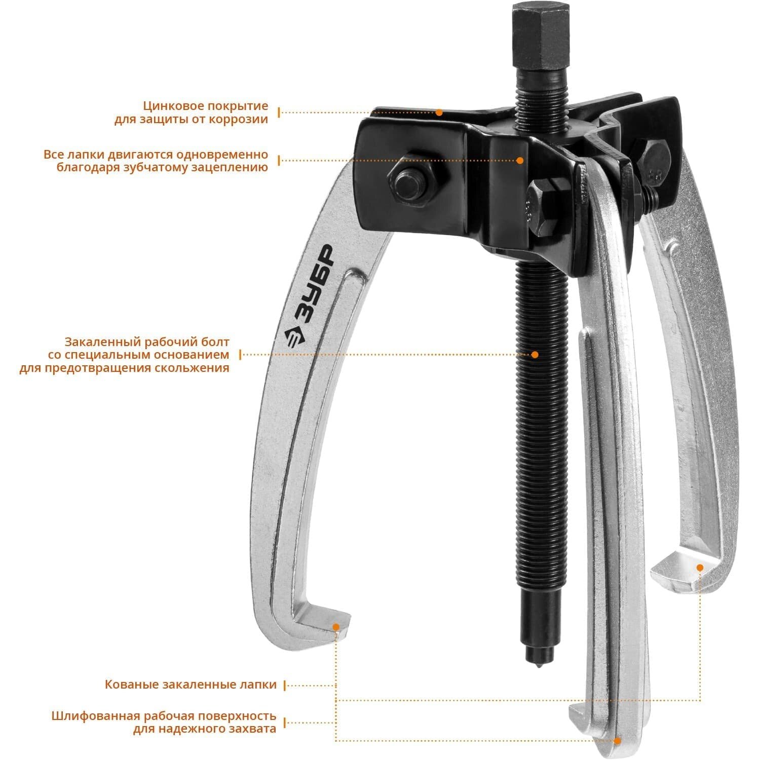 Съемник шарнирный 3-захватный с серповидными захватами, 160 мм, ЗУБР Профессионал . Захваты съемника выкованы из качественной инструментальной стали, что обеспечивает долгий срок службы при работе с высокими нагрузками.
