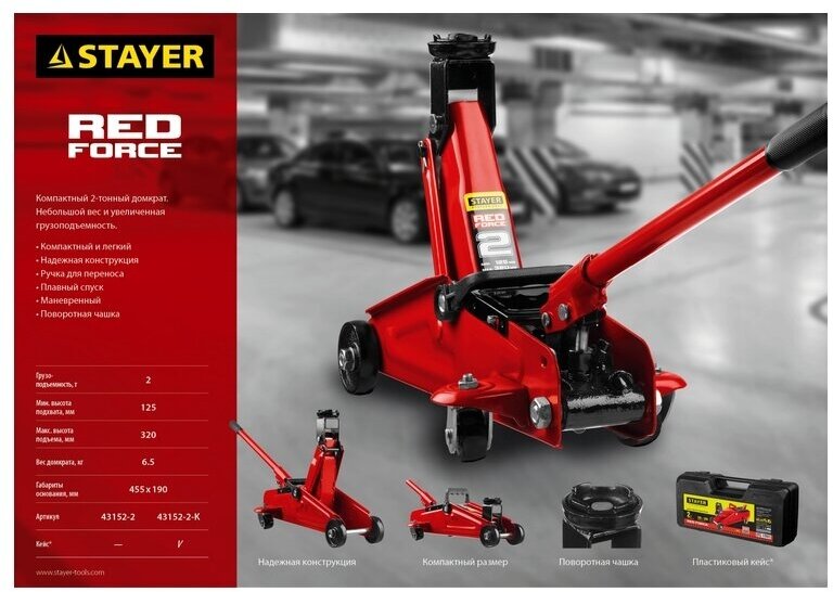 | Доп. наименование Водопад | Домкрат Stayer R-22 RED FORCE 43152-2 подкатной для легковых а/м 2т 125-320мм |