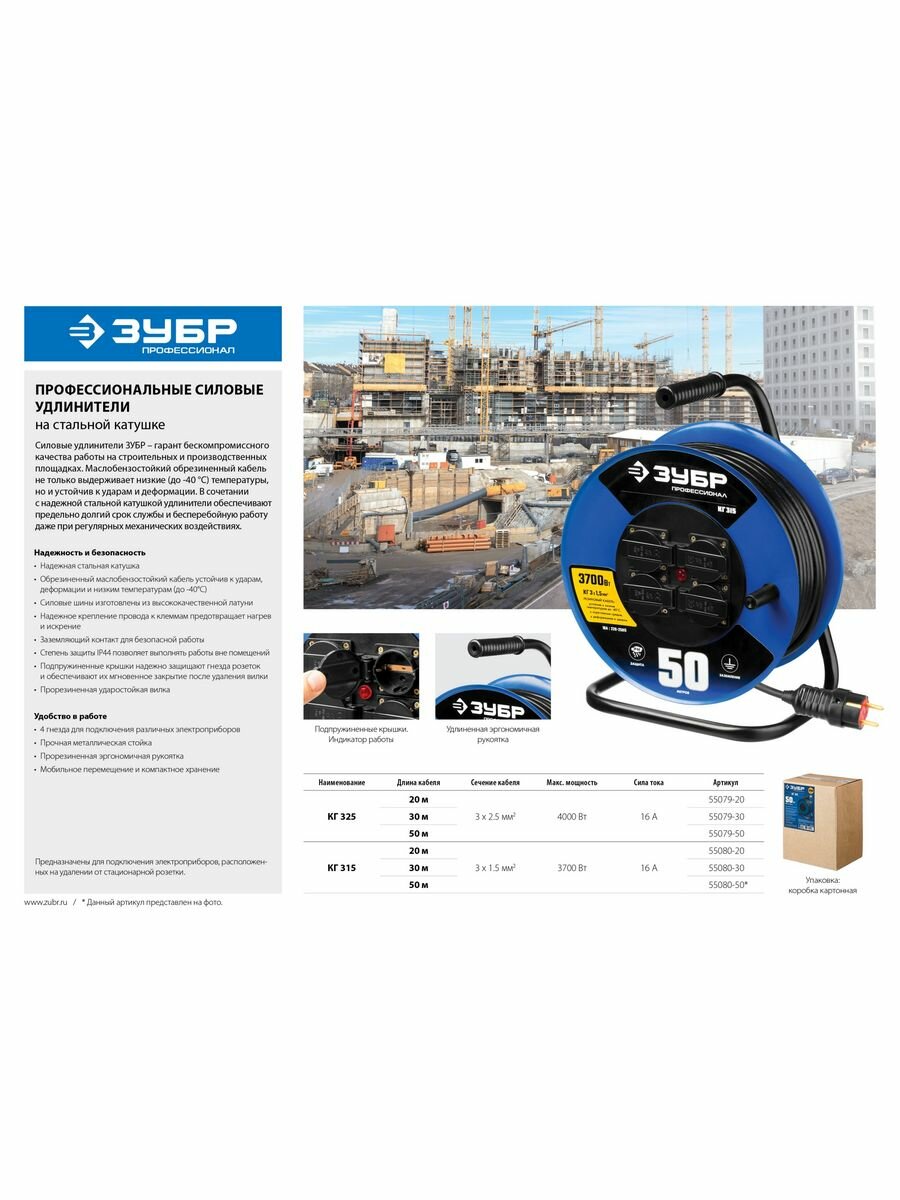 | Доп. наименование Водопад | Удлинитель на катушке Зубр Профессионал КГ-315 55080-30 30м 3700Вт 4 гнезда IP44 3х1.5 мм² |