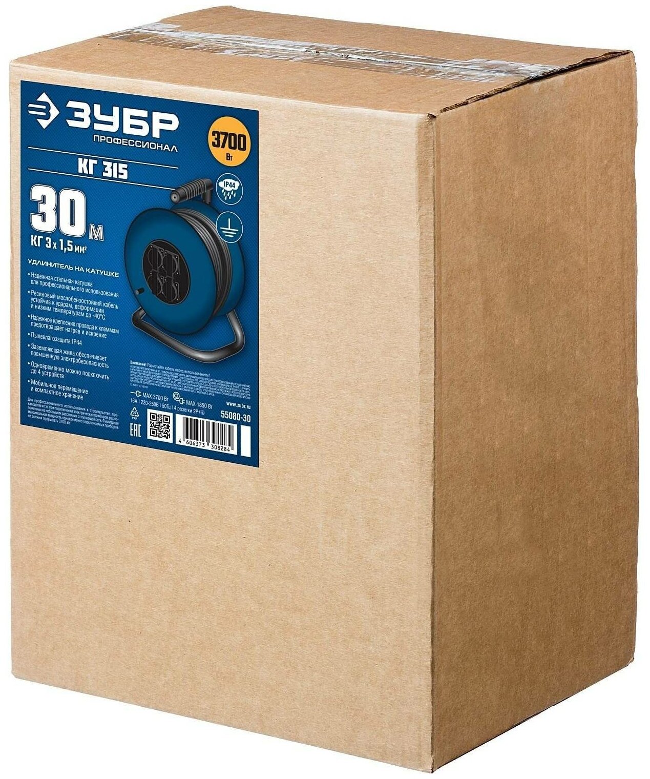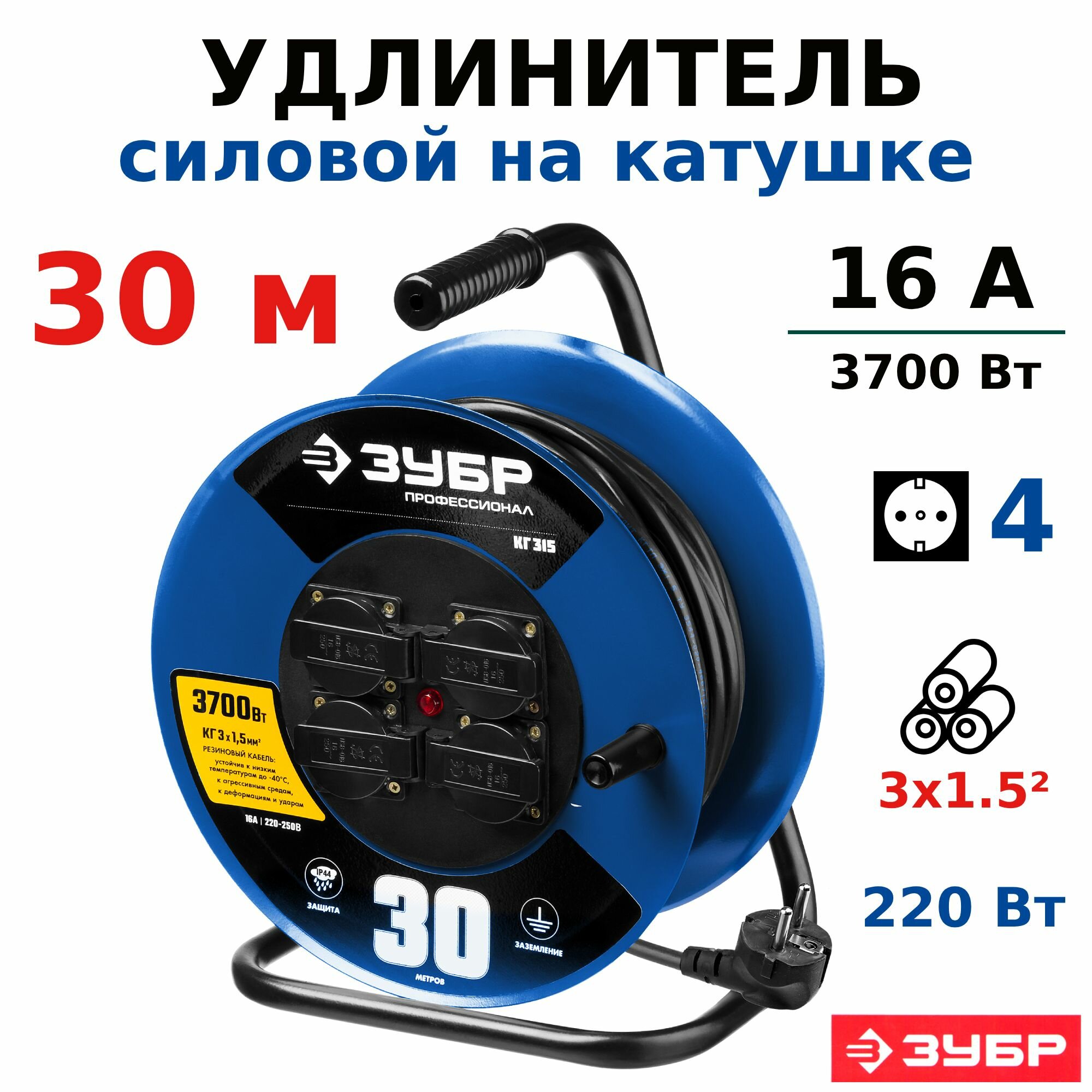 Удлинитель на катушке КГ 315, 30 м, 3700 Вт, 4 гнезда, IP44, КГ 3х1,5 кв мм, ЗУБР Профессионал