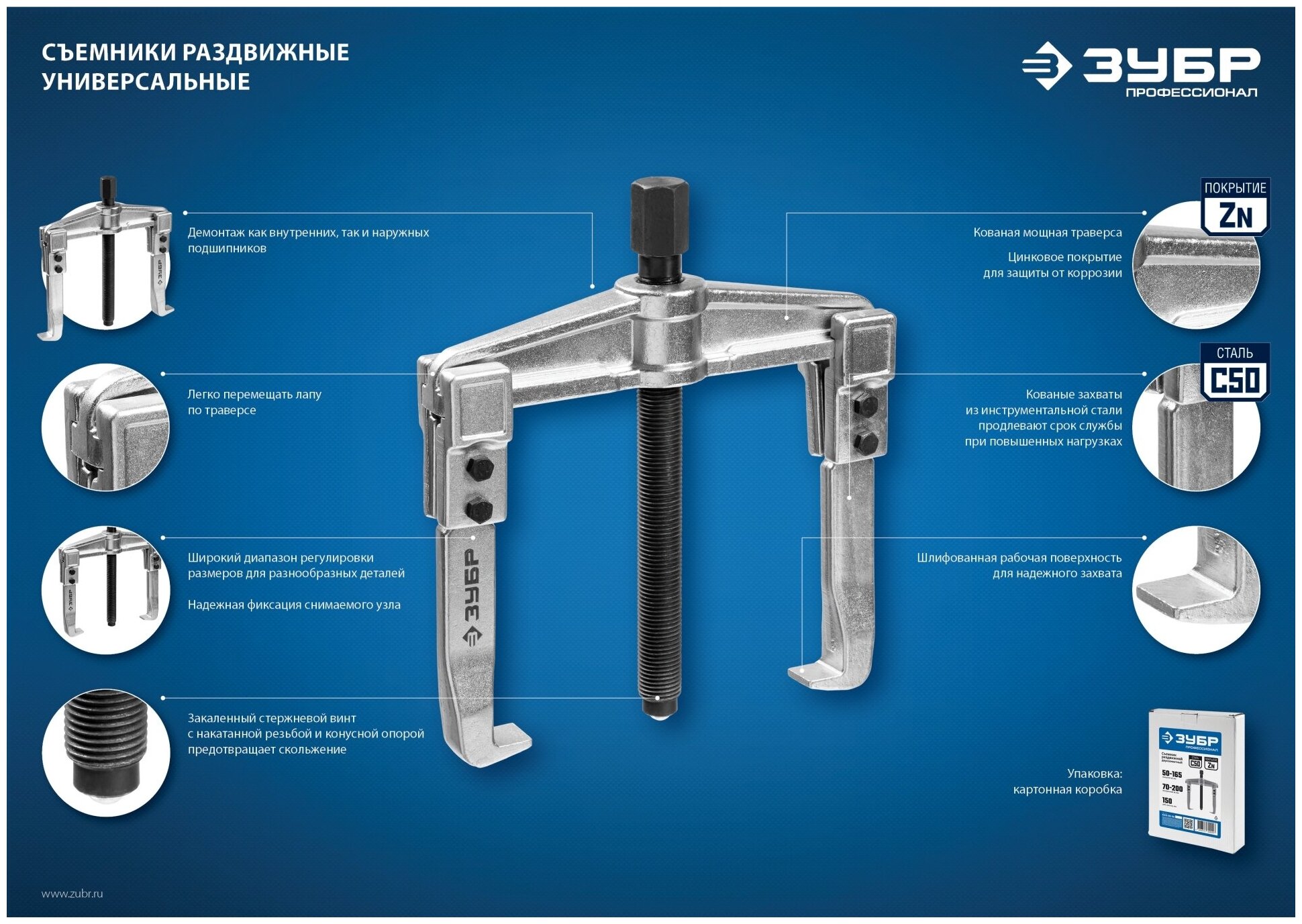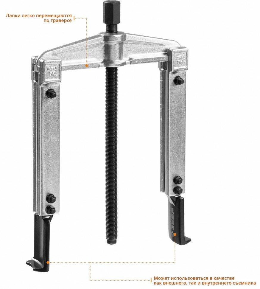 Съемник раздвижной 2-захватный с тонкими захватами, 100 мм, ЗУБР Профессионал . Захваты съемника выкованы из качественной инструментальной стали, что обеспечивает долгий срок службы при работе с высокими нагрузками. Позволяет работать с широким рядом узлов. Уменьшенные по толщине захваты дают возможность работать в условиях ограниченного пространства.