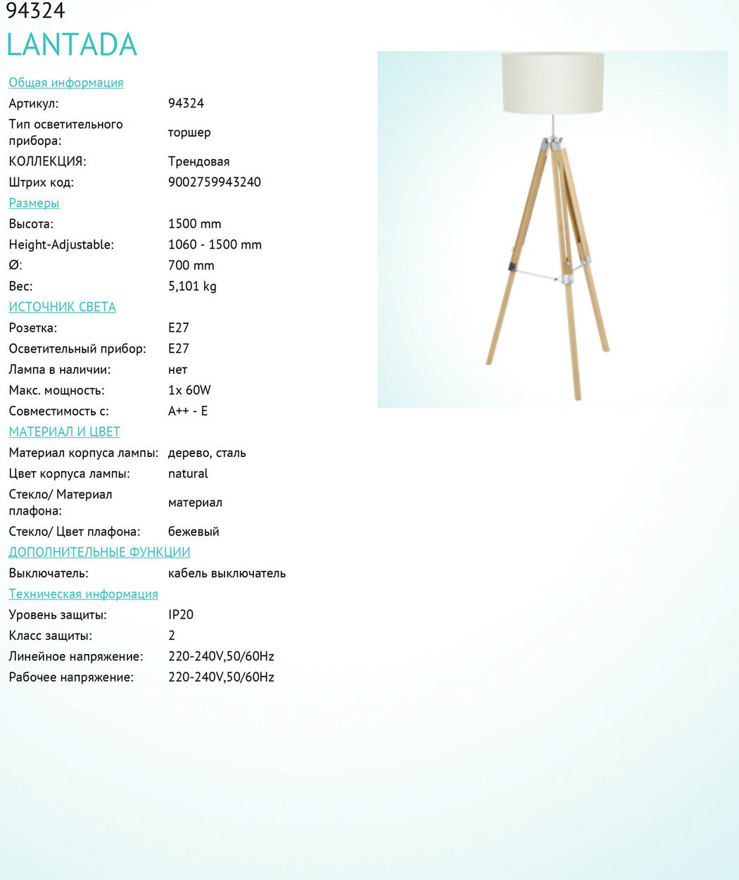 На сегодняшний день товар «Торшер Eglo Lantada 94324» можно купить с кешбеком в 1 магазине: Яндекс.Маркет