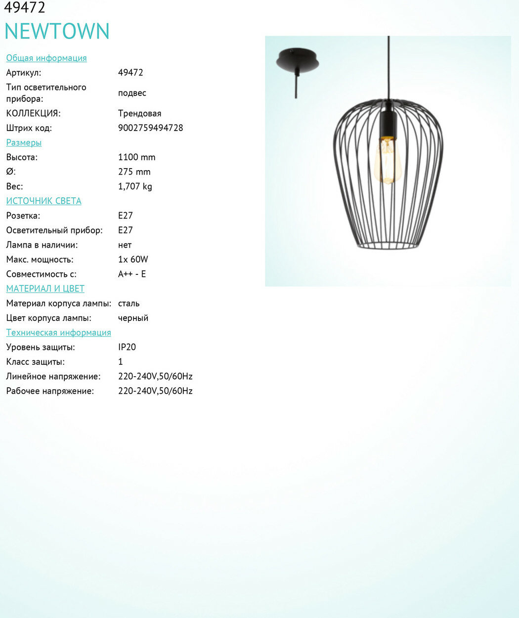 Сервис сравнения цен СкидкаГИД предлагает сравнить цены на товар «Подвес Eglo Newtown 49472»