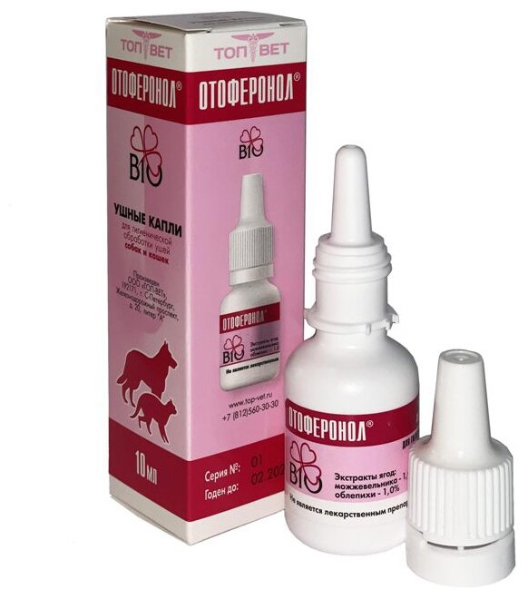 Капли для очистки ушей с противовоспалительным эффектом для кошек и собак. Слух наших домашних питомцев является вторым по важности органом чувств и играет немаловажную роль в обмене информацией с окружающей средой. Наружный слуховой проход - это чувствительная структура, которая легко подвергается заболеваниям. Основными факторами, вызывающими воспаление наружного уха, являются развитие общей или местной инфекции, ушные клещи, накопления серы и преобразование ее в ушную пробку, а также влажная среда, попавшее в ухо мыло, инородные тела и аллергия. Боль в ухе не только неприятна, но она может отразиться на характере животного. Зловонный запах раздражает и озлобляет животное, а постоянный зуд и шум в ушах приводит к расчесам и ранам ушной раковины. Именно поэтому уход за ушами должен быть регулярным и подходить к нему следует с особой аккуратностью и осторожностью. Капли Отоферонол Био на основе растительных компонентов удаляют грязь и оставляют защитный налет, позволяя содержать уши ваших питомцев в чистоте и предохранять их от развития патологических процессов.