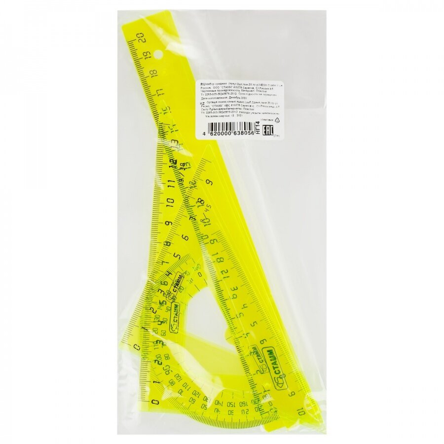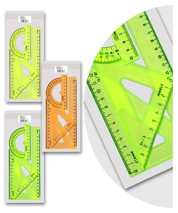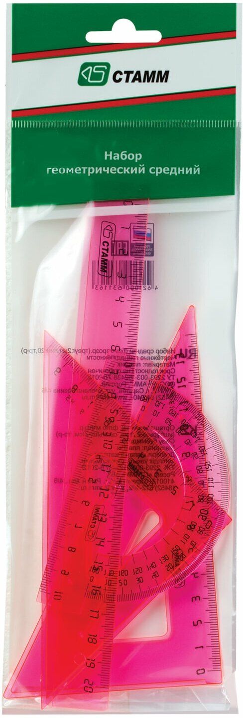 Чертежный набор средний из сертифицированного полистирола включает четыре предмета: линейка, 2 треугольника, транспортир. Предназначен для чертёжных работ.