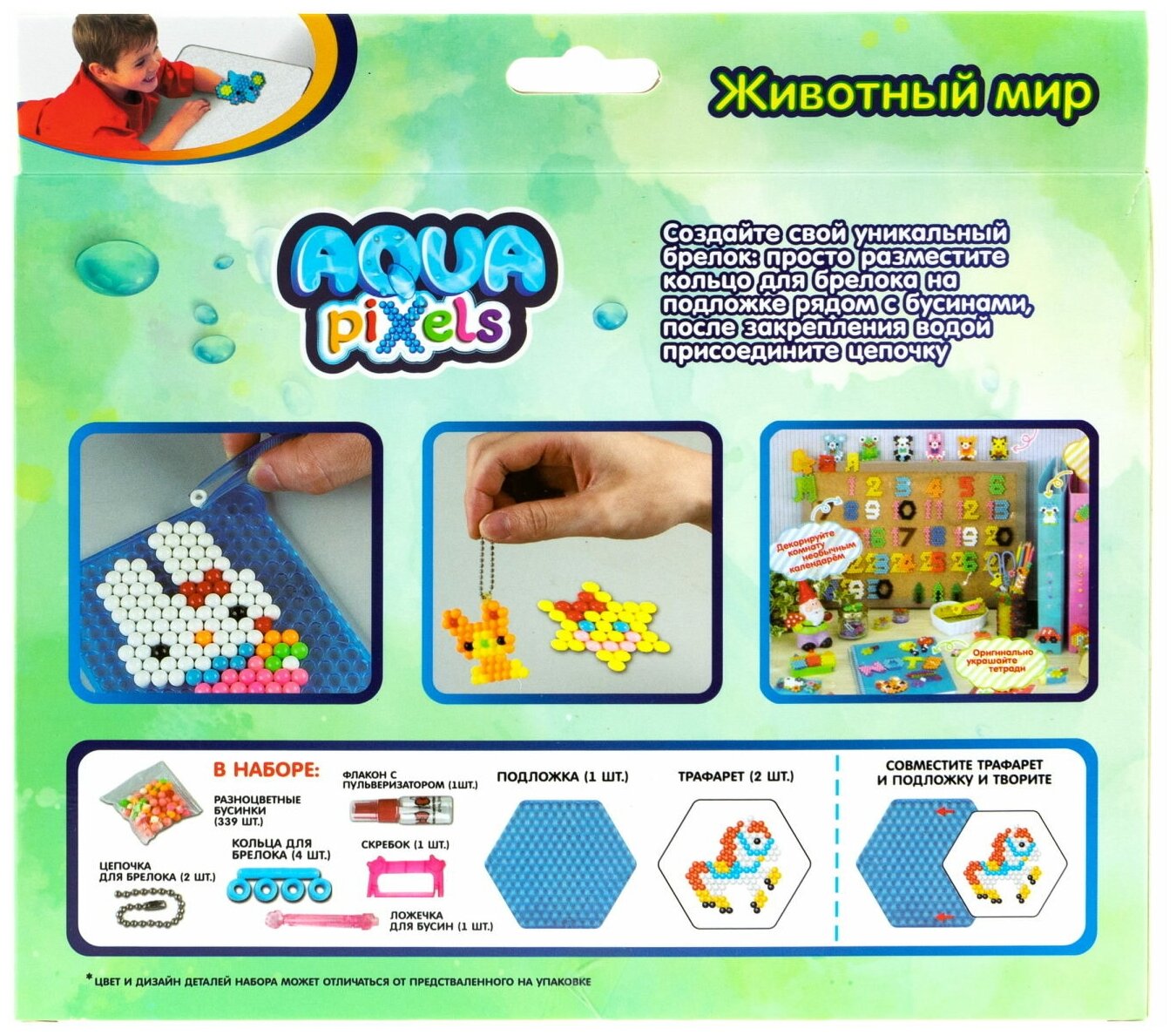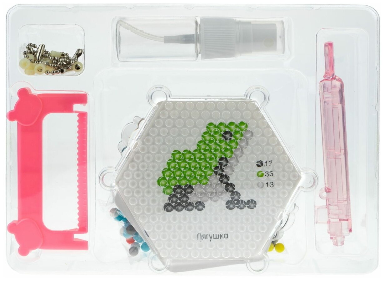Составляющие этого набора помогут крохам дополнить свои сумочки и рюкзачки необычными брелоками, созданными своими руками. Детям необходимо сначала выложить по трафарету на подложке фигурку одного из животных, а потом останется лишь побрызгать ее водой, и через некоторое время бусины скрепятся между собой. Дальше можно дополнить объемных зверьков колечками и цепочками, чтобы получить яркий брелок в виде лягушки и уточки. Таким образом, дети одновременно смогут потренировать мелкую моторику рук, а также проявят фантазию, придумывая свои варианты поделок из необычных бусинок.