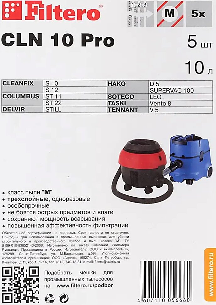 | Прочие особенности и свойства | Мешки для промышленных пылесосов Filtero CLN 10 Pro, 3-х слойные, произведены из синтетического микроволокна MicroFib®. Прочность синтетических мешков Filtero CLN 10 Pro превосходит любые бумажные мешки-аналоги, даже если это оригинальные бумажные мешки всемирно известных марок. Вы можете быть уверены:заклепки, гвозди, шурупы, битое стекло, острые камни и пр. не смогут прорвать мешки Filtero Pro. Мешки Filtero Pro не боятся влаги, и даже вода, попавшая в мешок, не помешает вам произвести качественную уборку!,,Мешки Filtero Pro предназначены для уборки пыли классов «L» и «М». |