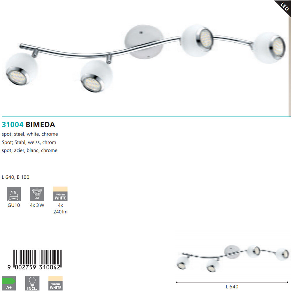 Спот с тремя и более плафонами Eglo серии BIMEDA. Подчеркнет индивидуальность вашего интерьера. Размеры 64x0x64 cm. Параметры пылевлагозащиты IP — 20. Плафон металлический белого цвета, а материал/цвет арматуры металл/белый. Использует 4 лампы с цоколем GU10. Площадь освещения охватывает 6 m². Идеально подходит для офиса, для гостиной, для спальни. Страна происхождения бренда — АВСТРИЯ. Вес с упаковкой 1.3 kg