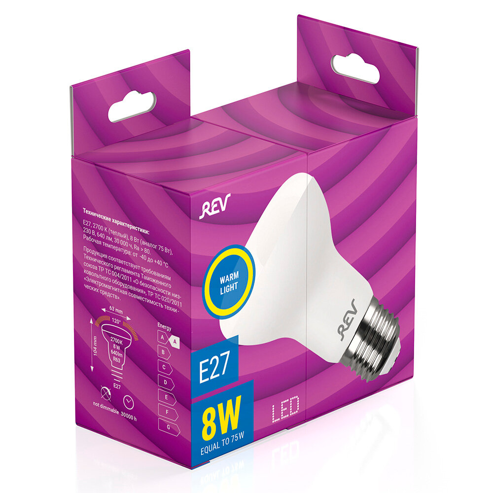 Энергосберегающая светодиодная лампа "REV" используется как в бытовых осветительных приборах, так и для освещения общественных и служебных помещений. Потребляемая мощность энергосберегающих ламп в 5-10 раз ниже, чем у обычных ламп накаливания при той же интенсивности свечения.Энергосберегающая светодиодная лампа в форме R63 теплого свечения. Интенсивность свечения аналогична обычной лампе накаливания мощностью 65 Вт. Срок службы 30 000 часов. Номинальное напряжение 220-240 В.