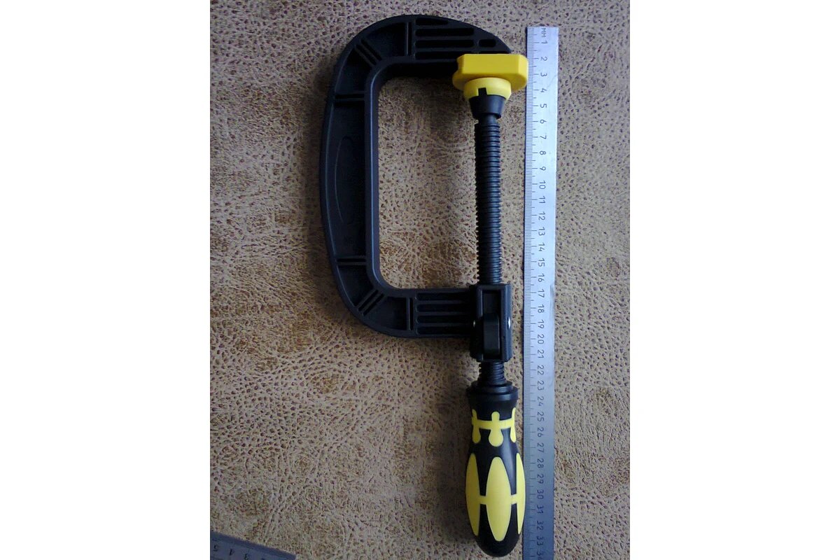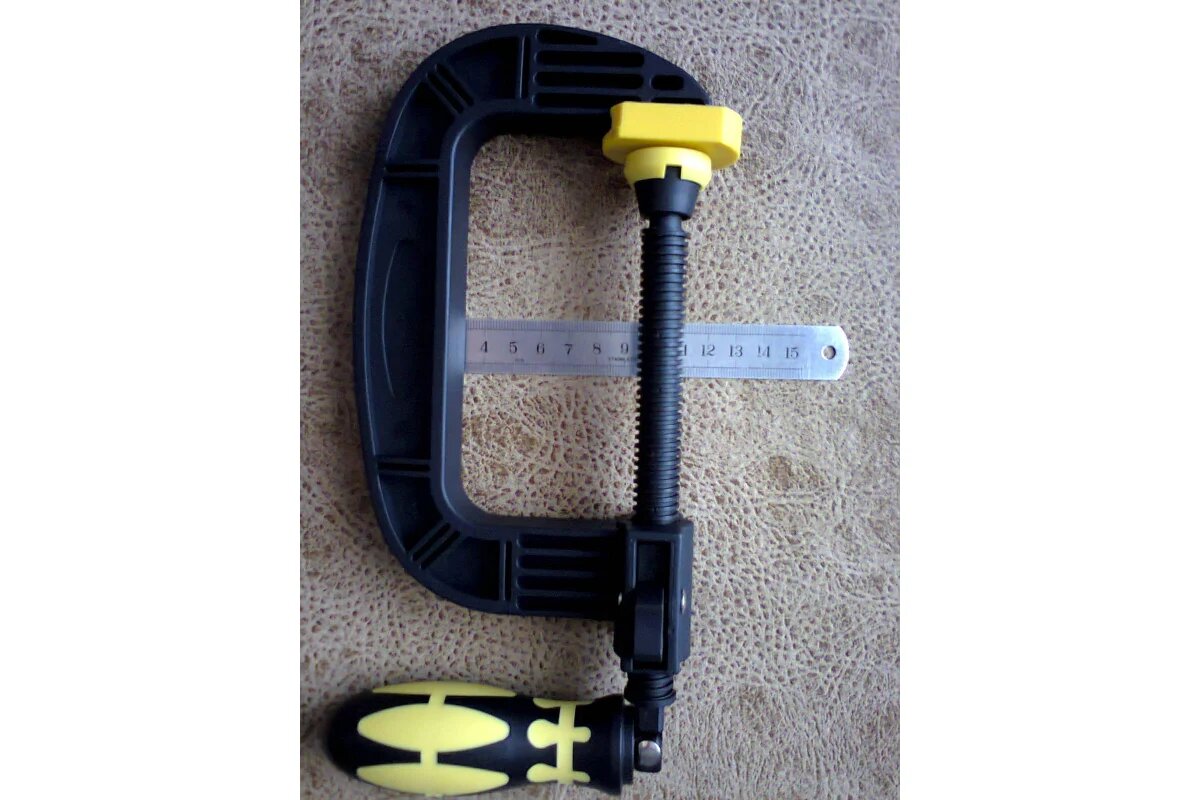Из - за того, что сделана из пластмассы, вряд ли Топекс 12A можно использовать в профессиональных столярных цехах. Для дома вполне сгодится, помогает мне зафиксировать деталь, особенно, если нужно долго держать для склеивания нескольких элементов между собой. Резьба плавно прокручивается, держатели прижимаются плотно. На них есть накладки, чтоб деталь не повредить или помять.
