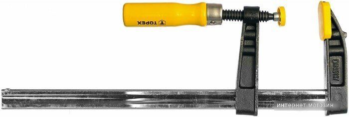 | Прочие особенности и свойства | Струбцина столярная TOPEX в основном предназначена для столярных работ. Облегчает крепление обрабатываемых деталей к столу, а также правильную сборку изделия. Имеет стальную направляющую повышенной прочности с пазами, помогающими удерживать плечо в необходимом положении. Дополнительным преимуществом являются пластмассовые накладки, защищающие от царапин, а также деревянная лакированная рукоятка эргономичной формы. |