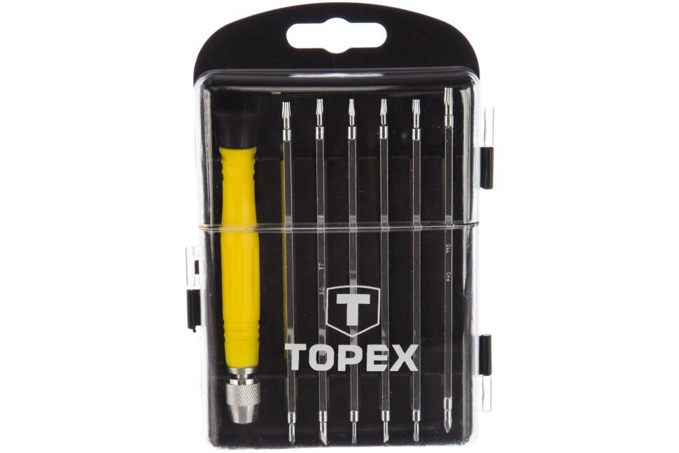 | Прочие особенности и свойства | Комплект прецизионных наконечников TOPEX, в наборе 6 двухсторонних стержней, то есть 12 наконечников. 1.5 мм x T5, 2 мм x T6, 3 мм x T7, PH000 x T8, PH00 x T9, PH0 x T10, Отверточная рукоятка |