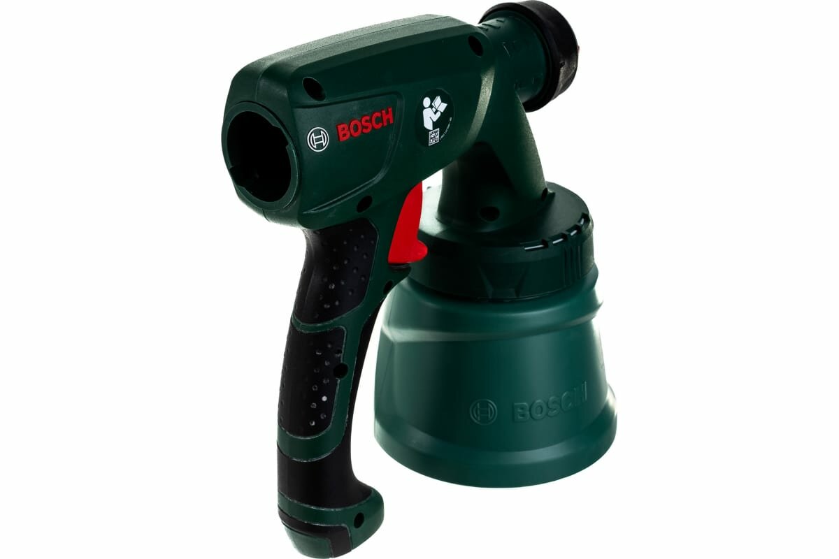 Зачем красить кисточкой, тратить кучу времени, если можно просто купить Bosch, заправить бачок краской и буквально за полчаса покрасить большую площадь. Количество распыляемой краски удобно регулируется, можно подкрутить форсунку для большей точности распыления, ручка очень удобная, прорезиненная, работает от сети. Покупал тут, ранее видел такой у друга, он очень советовал покупать для домашних работ. Кнопка спуска очень резкая, так что нужно сперва настроится и приготовится, потом начинать работу. Колба с краской легко раскручивается, есть защитная крышка в комплекте. Во время работы не гудит и не греется, работать им очень комфортно.