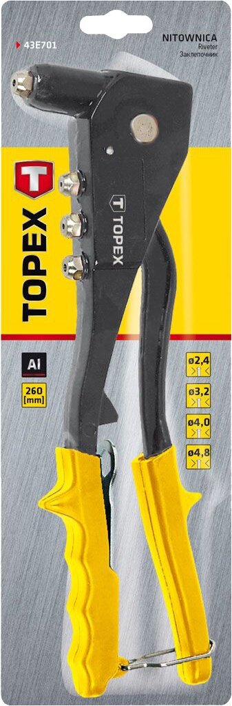 Заклепочник TOPEX для алюминиевых заклепок диаметром 2.4, 3.2, 4.0, 4.8 мм. Корпус заклепочника изготовлен из алюминиевого сплава, рычаг - кованый, стальной. Удобные рукоятки с блокировочным кольцом, облегчающим хранение. Бренд TOPEX предназначен для домашних мастеров.
