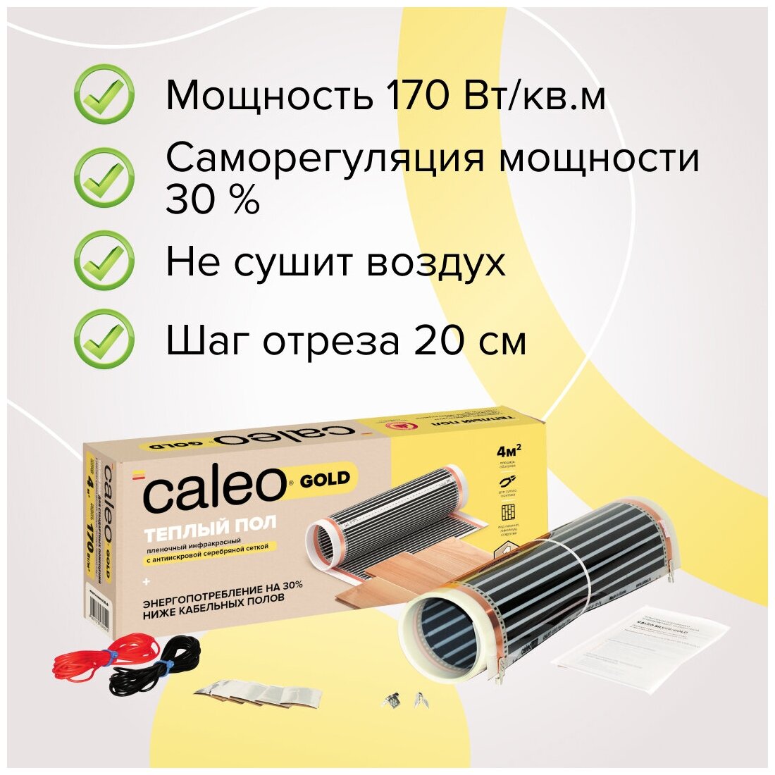 Термопленка CALEO GOLD дополнительно к антиискровой сетке обладает эффектом саморегуляции: при увеличении температуры пола потребляемая мощность снижается в 1,5 - 1,8 раза, что гарантирует быстрый нагрев при меньшем потреблении электроэнергии. Особенности: Экономичнее кабельного теплого пола до 30%.Быстрый и легкий монтаж без стяжки и клея.Антиискровая серебряная сетка.170 Вт/м2 — для стандартных помещений (детские, гостиные, коридоры и др.).Быстрее нагревается — меньше потребляет.Инфракрасный пленочный теплый пол четвертого поколения.