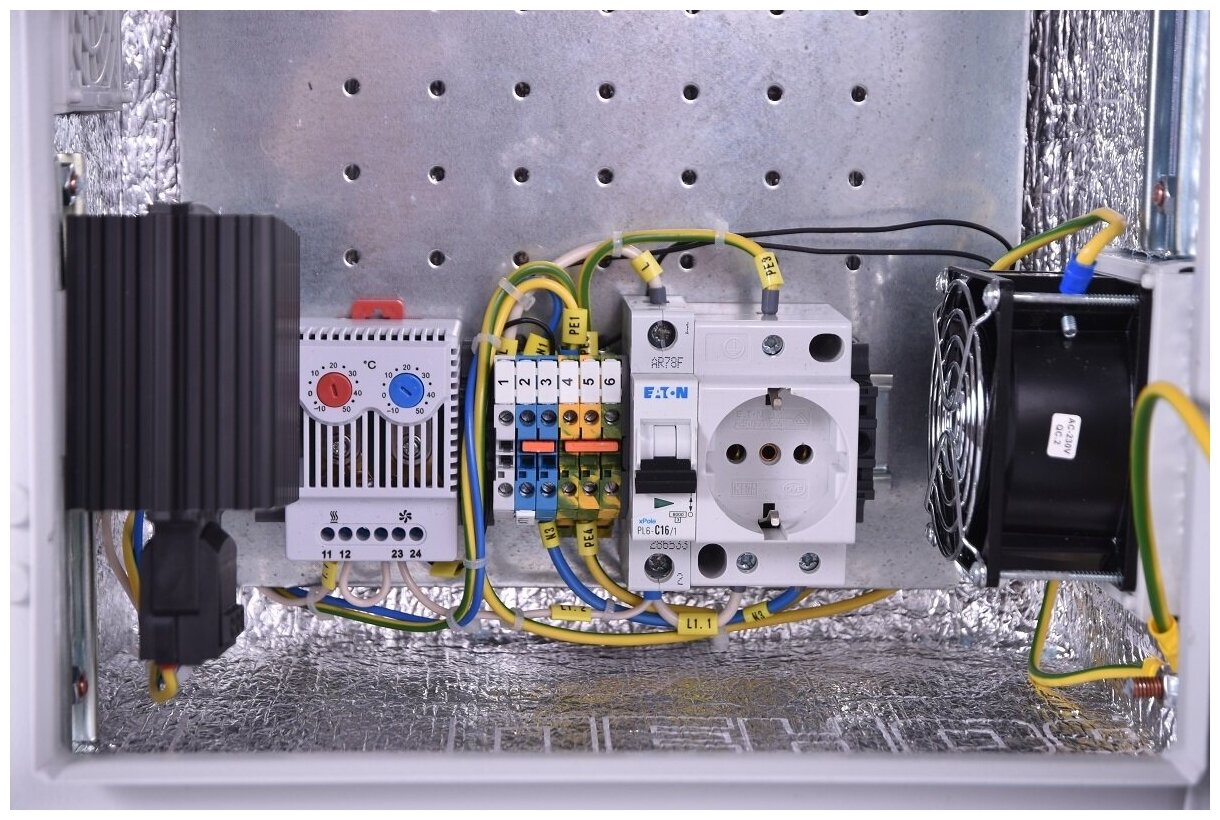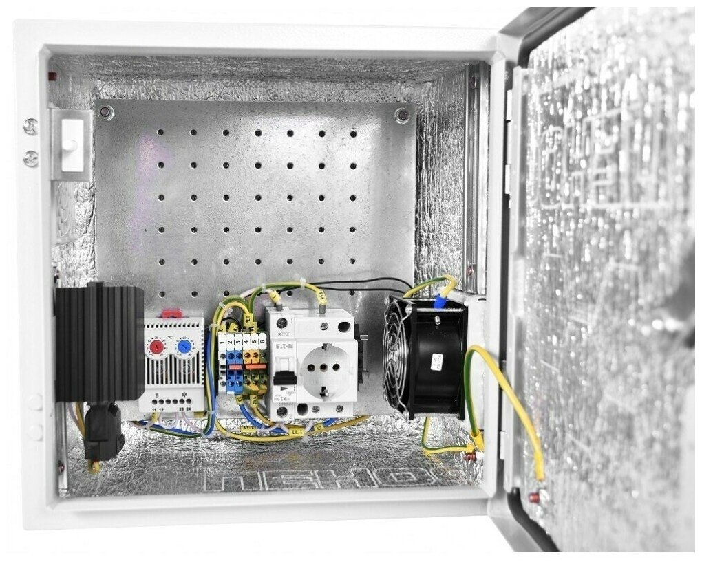 | Характеристики | Полезная глубина, мм 220, Комплектация С нагревом и охлаждением, Цвет Серый RAL 7035, Полезная глубина электротехнического отсека, мм 220, Вес изделия, кг 13, Мощность нагревателя, Вт 60, Шкафы серии ШТВ-НЭ укомплектованные предназначены для размещения систем видеонаблюдения, систем безопасности и телекоммуникационного оборудования., Шкафы используются для размещения автономно функционирующего активного и пассивного телекоммуникационного оборудования, обеспечивают защиту от воздействия окружающей среды и несанкционированного доступа, а также поддерживают температурно-влажностный режим внутри шкафа., Изделие рассчитано на питание от сети переменного тока 230 В частотой 50 Гц. Изделие имеет климатическое исполнение У 1 по ГОСТ 15150-69 и предназначено для уличной эксплуатации при температуре от минус 50 до плюс 45 °С при относительной влажности не более 80 % при 20 °С., Шкаф крепится на стену при помощи 4 уголков (анкеры не входят в комплект поставки), при необходимости можно применить крепление на столб ККС-ШТВ-НЭ (не входит в комплект поставки)., В качестве дополнительной защиты от вредных факторов окружающей среды, можно устанавливать крашу дождевую модели КД-ШТВ-НЭ (не входит в комплект поставки), а в комплектации Т1 для защиты вентилятора и выпускного фильтра можно устанавливать козырьки защитные КЗ-ШТВ-НЭ (не входят в комплект поставки)., В основании шкафа предусмотрены круглые отверстия для ввода кабелей, выполненные методом формования. В зависимости от размера подводимого кабеля, необходимо удалить заглушку подходящего размера и завести кабель внутрь шкафа через гермоввод подходящего размера типа MG12, MG20, MG32 (в комплект поставки не входят). Конструкция заглушек предполагает разное количество отверстий различного диаметра для установки кабельных вводов по потребностям заказчика., За счёт имеющихся отверстий, шкафы легко можно крепить вертикально по два и более штук. При этом перевесив дверь нижнего шкафа, шкафы можно сориентировать кабельными вводами друг к другу, что позволит свободно прокладывать кабеля между шкафами. |