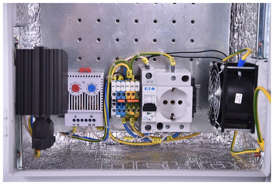 | Характеристики | Полезная глубина, мм 220, Комплектация С нагревом, без охлаждения, Цвет Серый RAL 7035, Полезная глубина электротехнического отсека, мм 220, Вес изделия, кг 12, Мощность нагревателя, Вт 60, Шкафы серии ШТВ-НЭ укомплектованные предназначены для размещения систем видеонаблюдения, систем безопасности и телекоммуникационного оборудования., Шкафы используются для размещения автономно функционирующего активного и пассивного телекоммуникационного оборудования, обеспечивают защиту от воздействия окружающей среды и несанкционированного доступа, а также поддерживают температурно-влажностный режим внутри шкафа., Изделие рассчитано на питание от сети переменного тока 230 В частотой 50 Гц. Изделие имеет климатическое исполнение У 1 по ГОСТ 15150-69 и предназначено для уличной эксплуатации при температуре от минус 50 до плюс 45 °С при относительной влажности не более 80 % при 20 °С., Шкаф крепится на стену при помощи 4 уголков (анкеры не входят в комплект поставки), при необходимости можно применить крепление на столб ККС-ШТВ-НЭ (не входит в комплект поставки)., В качестве дополнительной защиты от вредных факторов окружающей среды, можно устанавливать крашу дождевую модели КД-ШТВ-НЭ (не входит в комплект поставки), а в комплектации Т1 для защиты вентилятора и выпускного фильтра можно устанавливать козырьки защитные КЗ-ШТВ-НЭ (не входят в комплект поставки)., В основании шкафа предусмотрены круглые отверстия для ввода кабелей, выполненные методом формования. В зависимости от размера подводимого кабеля, необходимо удалить заглушку подходящего размера и завести кабель внутрь шкафа через гермоввод подходящего размера типа MG12, MG20, MG32 (в комплект поставки не входят). Конструкция заглушек предполагает разное количество отверстий различного диаметра для установки кабельных вводов по потребностям заказчика., За счёт имеющихся отверстий, шкафы легко можно крепить вертикально по два и более штук. При этом перевесив дверь нижнего шкафа, шкафы можно сориентировать кабельными вводами друг к другу, что позволит свободно прокладывать кабеля между шкафами. |