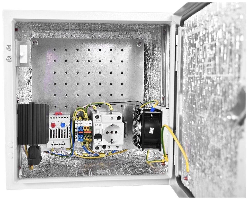 | Комплект поставки | корпус; дверь; заземление; вводной автоматический выключатель; датчик открытия двери; вентилятор; термостат; кабельные вводы |