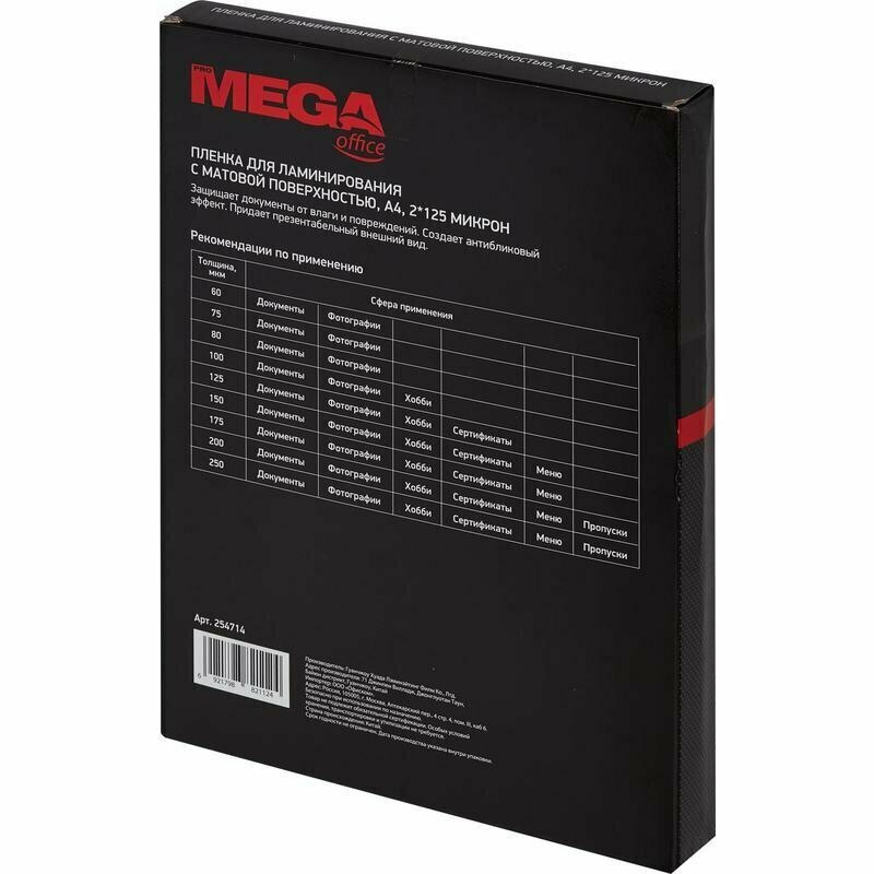 Пленка для ламинирования Promega office предназначена для защиты документов от механических повреждений и влаги,продлевают срок службы документов и придают им наиболее презентабельный вид. Все заготовки для ламинирования ProMegaOffice имеют прозрачность 99% и обладают антибликовыми свойствами. Широкий спектр размеров заготовок ProMegaOffice позволит вам заламинировать любые документы до А3 формата включительно. Обладает антистатическими свойствами.
