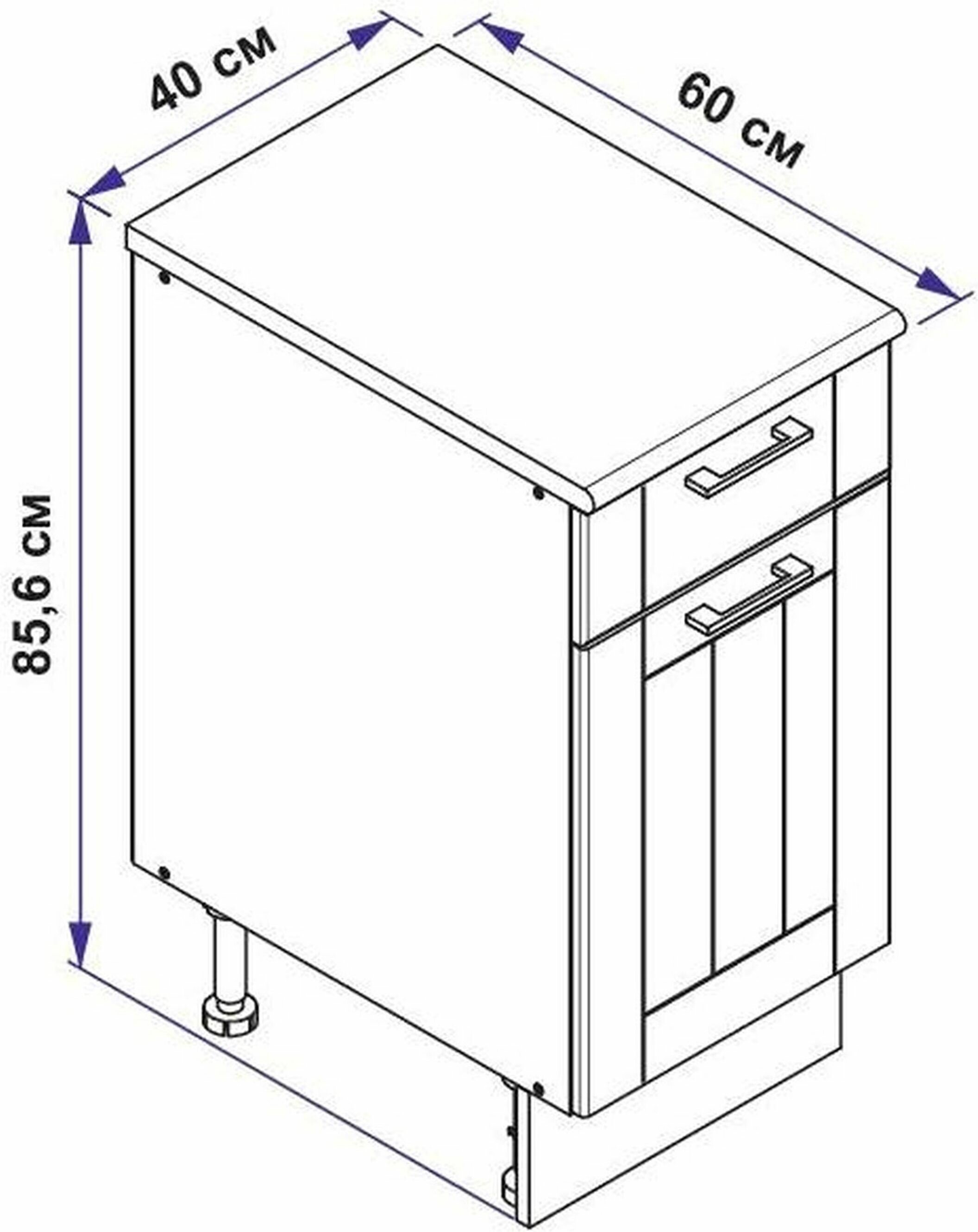 Напольный шкаф Кантри с фасадом 40 см оснащен столешницей, ящиком и закрытыми полками. В тумбочке удобно хранить столовые приборы, посуду, продукты, кухонные аксессуары и принадлежности.