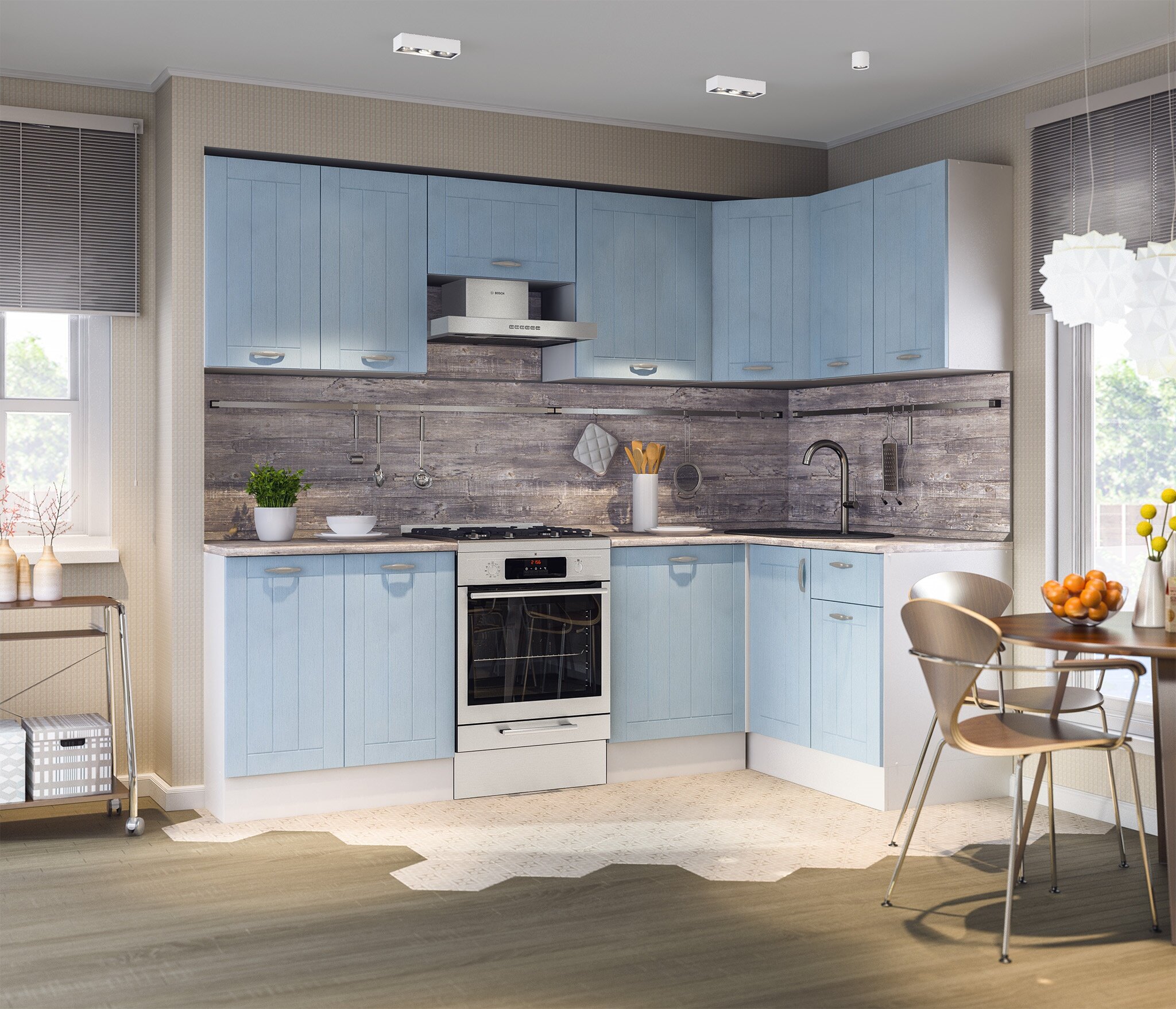 Мебель Кантри освежает интерьер за счет выигрышной комбинации белого и голубого цветов, поднимает настроение во время приготовления пищи или застолья. Фасады с едва различимой древесной текстурой придают гарнитуру изысканный и респектабельный вид.