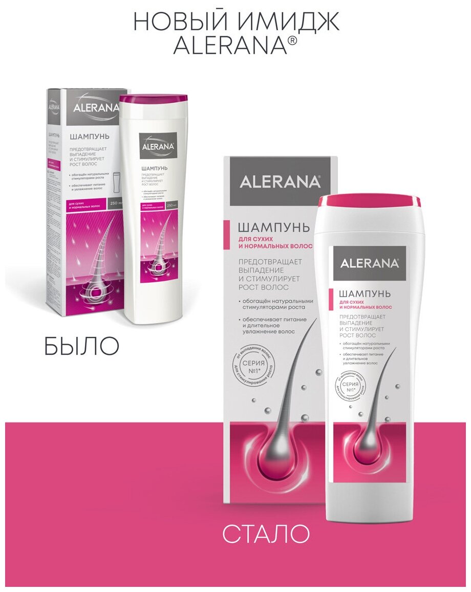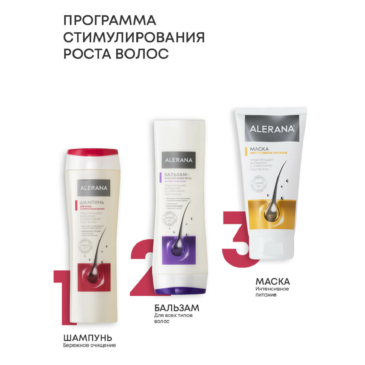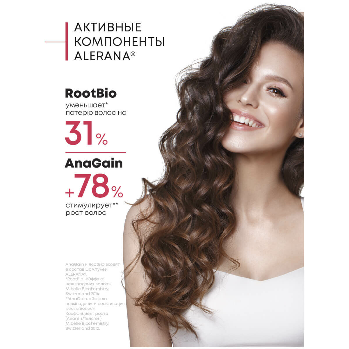 Шампунь Alerana разработан для укрепления ослабленных, выпадающих волос, обогащен натуральными стимуляторами роста. Уникальная формула шампуня Alerana разработана специалистами фармацевтической компании для укрепления ослабленных, склонных к выпадению волос. Шампунь дополнительно содержит богатое ненасыщенными жирными кислотами маковое масло, смягчающее сухую кожу головы, и лецитин, который восстанавливает секущиеся конца, придает волосам красивый и здоровый блеск.