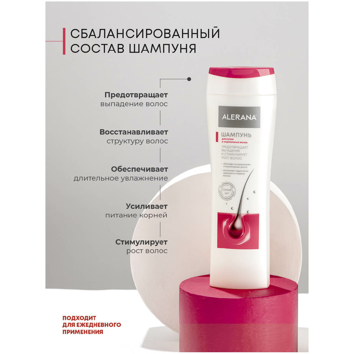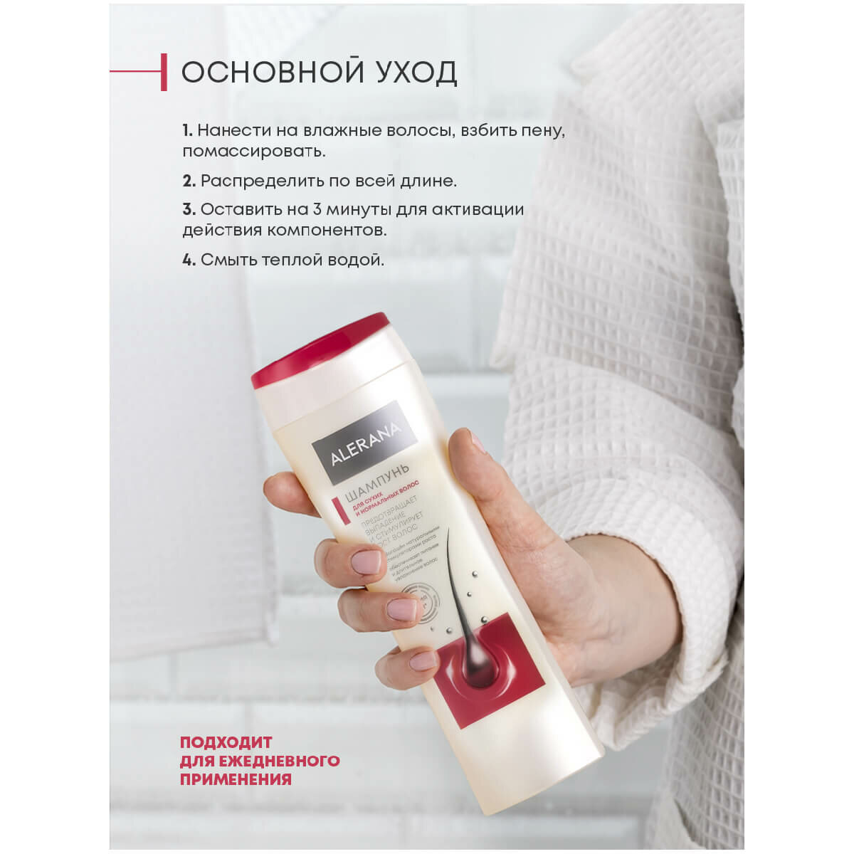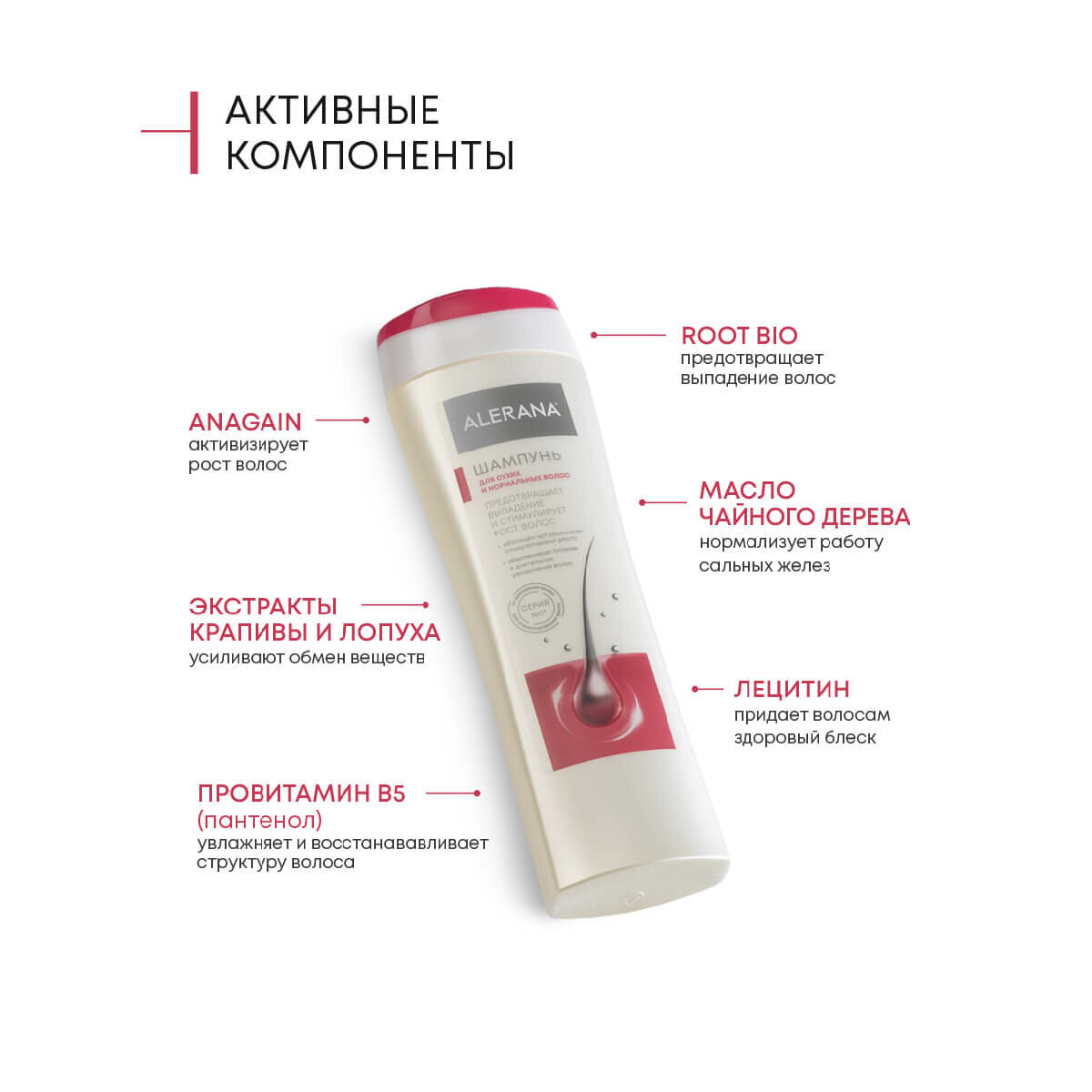 Шампунь Alerana разработан для укрепления ослабленных, выпадающих волос, обогащен натуральными стимуляторами роста. Уникальная формула шампуня Alerana разработана специалистами фармацевтической компании для укрепления ослабленных, склонных к выпадению волос. Шампунь дополнительно содержит богатое ненасыщенными жирными кислотами маковое масло, смягчающее сухую кожу головы, и лецитин, который восстанавливает секущиеся конца, придает волосам красивый и здоровый блеск.