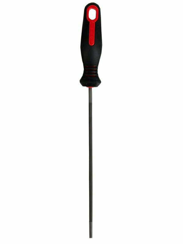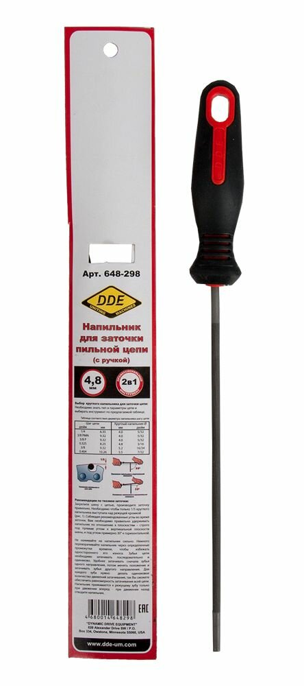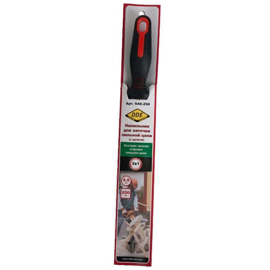 Напильник круглый с ручкой 4,8 мм - 3/16 DDE используется при заточке и правке пильных цепей, не снимая их с бензопилы. Напильник подходит для заточки цепей с шагом 0.325". Пластиковая ручка удобно лежит в руке.