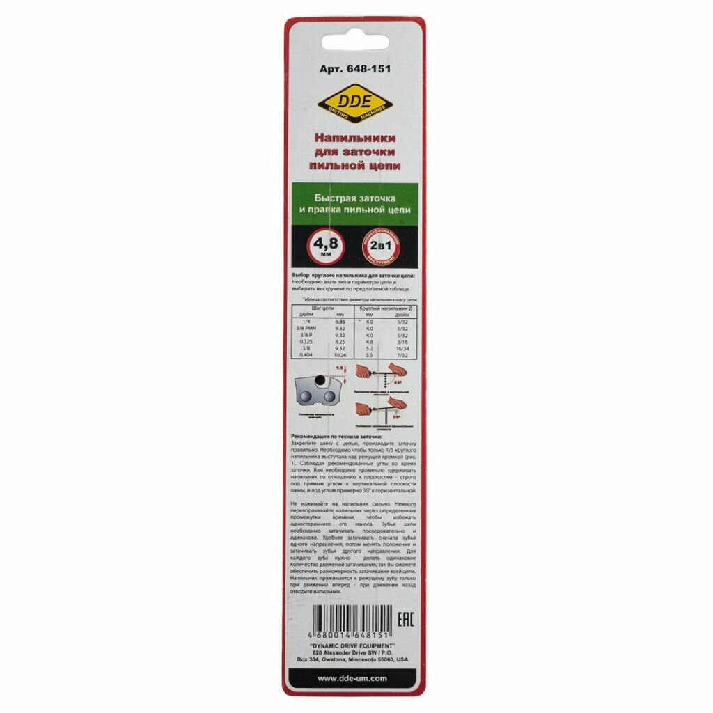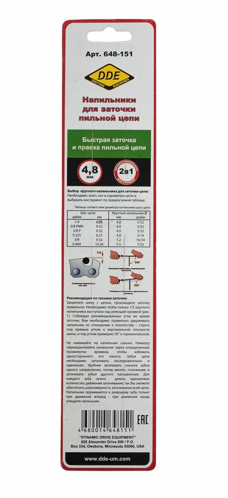 Напильник круглый 4,8 мм - 3/16 DDE используется при заточке и правке пильных цепей, не снимая их с бензопилы. Напильник подходит для заточки цепей с шагом 0.325". Поставляется в блистере, в комплекте 2 шт.