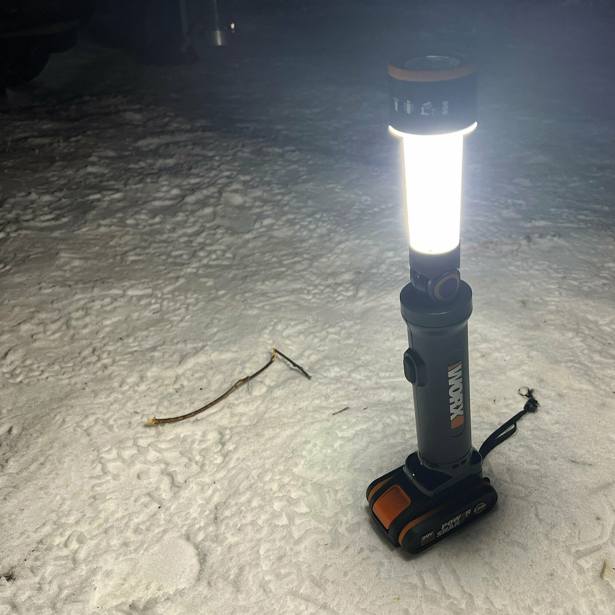 Аккумуляторный светодиодный фонарь WORX - 4 режима работы: классический фонарик, настольная лампа с двумя режимами работы (ночник и освещение на полной мощности), SOS сигнализация. Благодаря удобной телескопической ручке фонарик удобен при хранении и транспортировке. Поворотная головка 0-140 град. направляет луч в нужное место. Батарея POWERSHARE 20 В взаимозаменяема с другими инструментами WORX. Поставляется без АКБ и ЗУ Несмотря на компактный корпус и вес всего 400 гр без аккумулятора, фонарь WX027 совместил в себе множество полезных функций. Помимо классического фонаря, WX027 может использоваться как фонарь, как настольная лампа с полной мощностью, в качестве ночника с приглушенным светом или SOS сигнализатора. Функциональный и надежный фонарь незаменим на даче, в походах и путешествиях, в мастерской или гараже. Время автономной работы от аккумулятора составляет от 17 до 18 часов в зависимости от режима использования.