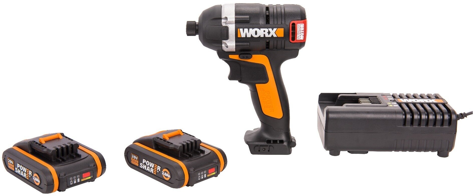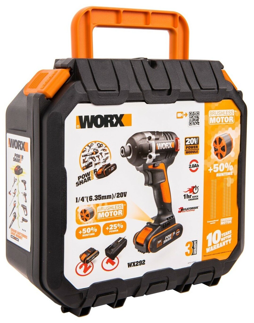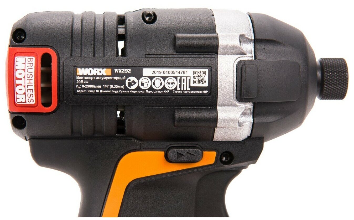 WORX BL это компактный и легкий винтоверт c бесщеточным двигателем. Который значительно улучшает характеристики устройства по сравнению с щеточной модели. А именно благодаря такому типу мотра гайковерт меньше нагревается, работает до 50% дольше и имеет на 25% больше крутящий момент. А самое главное срок службы мотора до 10 раз дольше. Модель оснащена креплением под биты(шестигранный (1/4HEX)), размер патрона 1/4 дюйма . А также имеет плавную регулировку скорости, импульсом для откручивания и закручивания. Винтоверт оснащен светодиодной подсветкой рабочей зоны. Поставляется в комплекте с 2-мя аккумуляторами WORX POWERSHARE 20В 2 А*ч, которые взаимозаменяемы с другими инструментами и садовой техникой WORX. Аккумуляторы WORX оснащены электронной платой управления с защитой от глубокого разряда и перегрева, что продлевает срок службы и увеличивает время работы. Данная модель поставляется в кейсе с зарядным устройством с функции быстрой зарядки за 1 час.