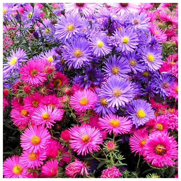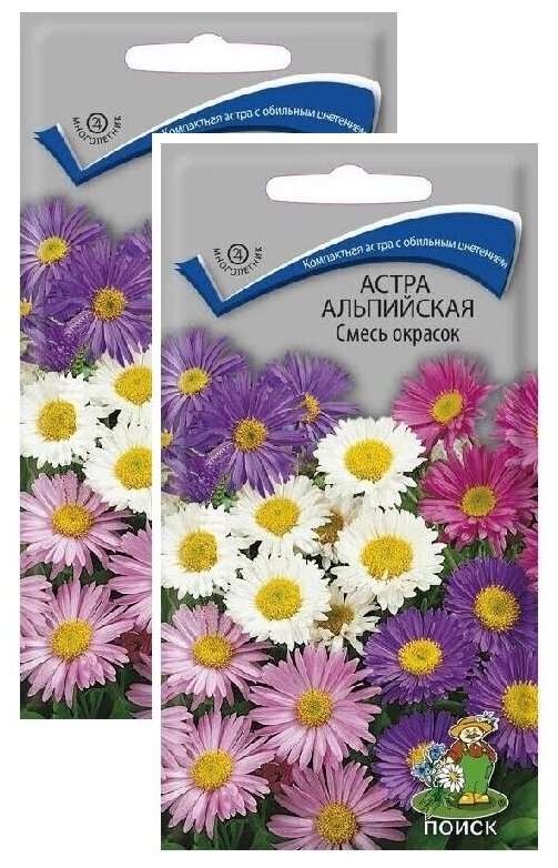 Астра альпийская Смесь окрасок - многолетнее растение, которое очень быстро разрастается. Его очаровательные цветки, похожие на ромашки, достигают в диаметре 4 см и хорошо стоят после срезки. Кустики формируются небольшие, высотой около 25-30 см, и отлично подходят для миксбордеров или садовых горшков.
