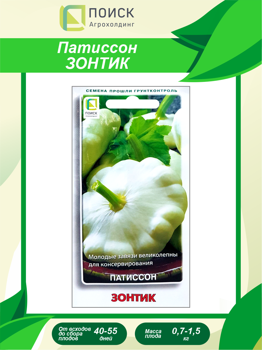 Патиссон сорта Зонтик дает урожай спустя 40-55 дней после первых всходов. Плоды с гладкой поверхностью чашевидной формы и зубчатыми краями. Сорт может похвастаться отменными вкусовыми свойствами, хорошей транспортабельностью, устойчивостью к мучнистой росе. Урожай в среднем составляет 4,5-5 кг на кв. м.